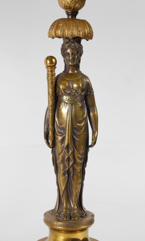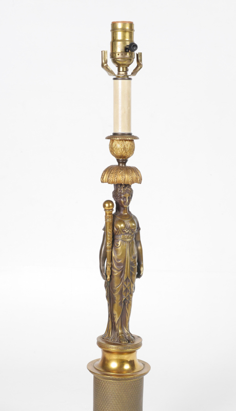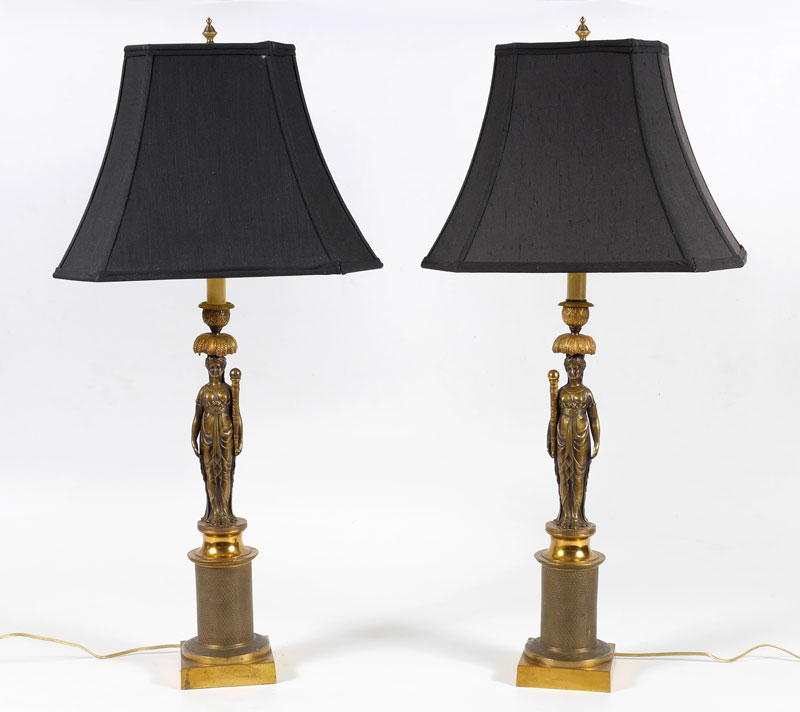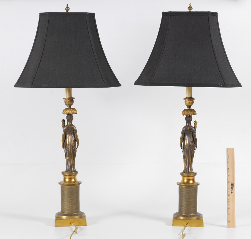 PAIR CARYATID REGENCY STYLE TABLE LAMPS: Cast brass base with figural caryatid center holding a torch with ball finial, single socket fixture, overall measures 25 3/4'' h. x 5'' x 5''. Sold with black cloth shades, 11 1/4'' x 16 1/4'' x 11 1/4''.