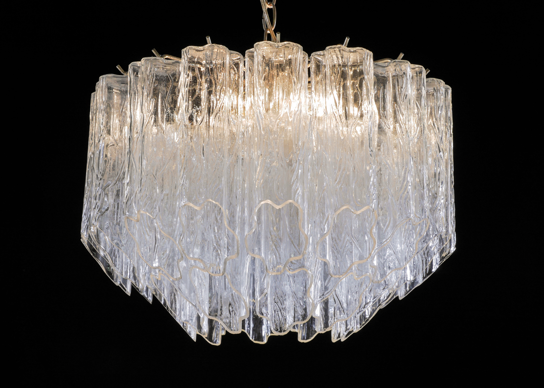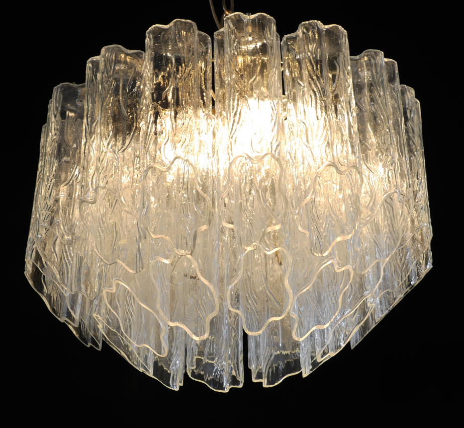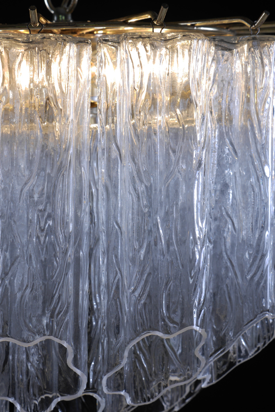 ATTRIB. VENINI ITALIAN BRASS & GLASS CHANDELIER: Circa 1960-70's, unmarked and attributed to Venini, Murano Italy. 26 floriform embossed glass tube drops on 2 levels, brass frame with 6 sockets. Overall assembled 13 1/4'' h. x 18'' dia., tube drops 10'' h. x 2 3/4'' dia.