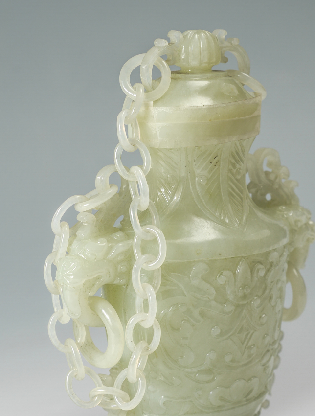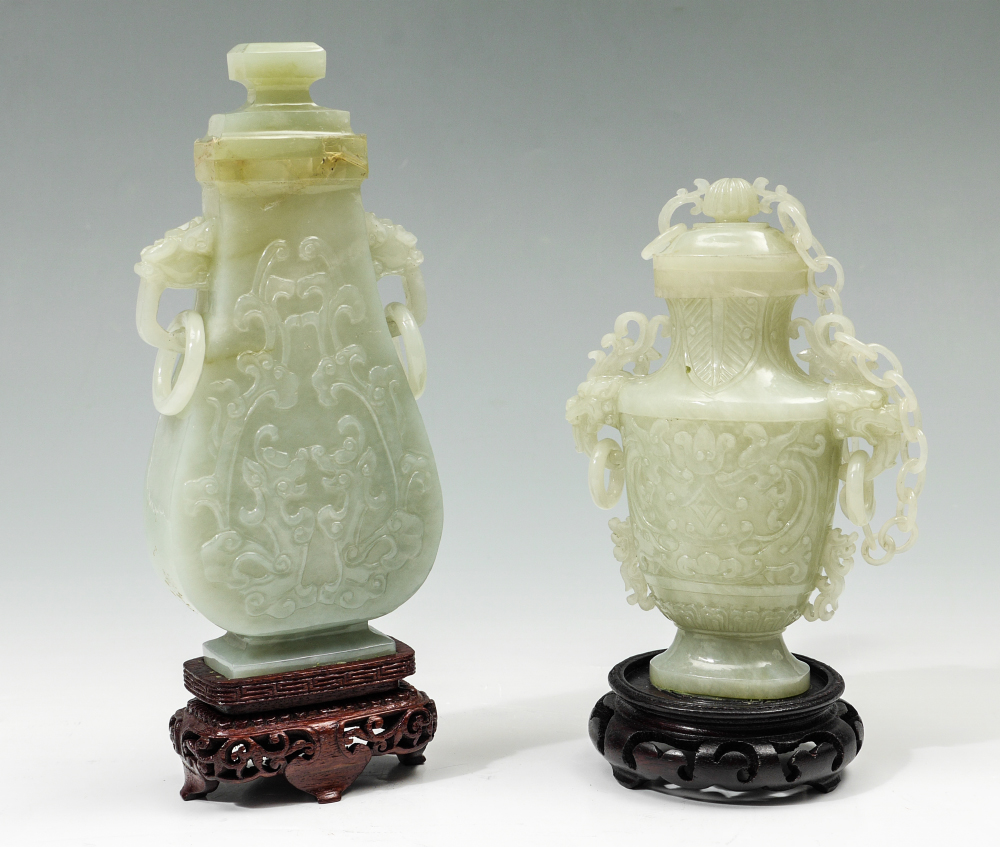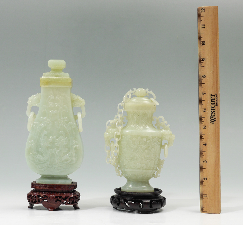 2 CHINESE CARVED JADE? COVERED VESSELS: 2 pieces carved jade or similar stone to include 1) Carved floral motifs, figural handles with rings, rectangular lid with finial taped to body, affixed to wood stand. Overall 9'' h. x 3 1/2'' x 2''. 2) Floral motifs, figural handles with rings, chain on right side connecting taped lid to handle, affixed to wood stand. 7 1/4'' h. x 4 1/2'' x 3 1/4''.
