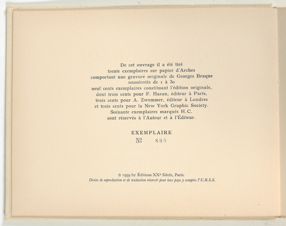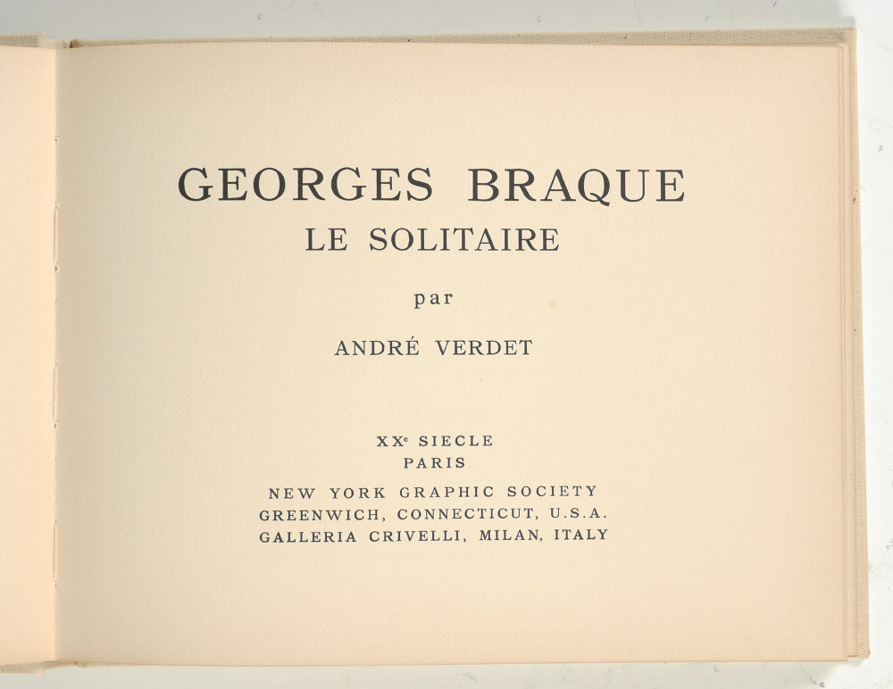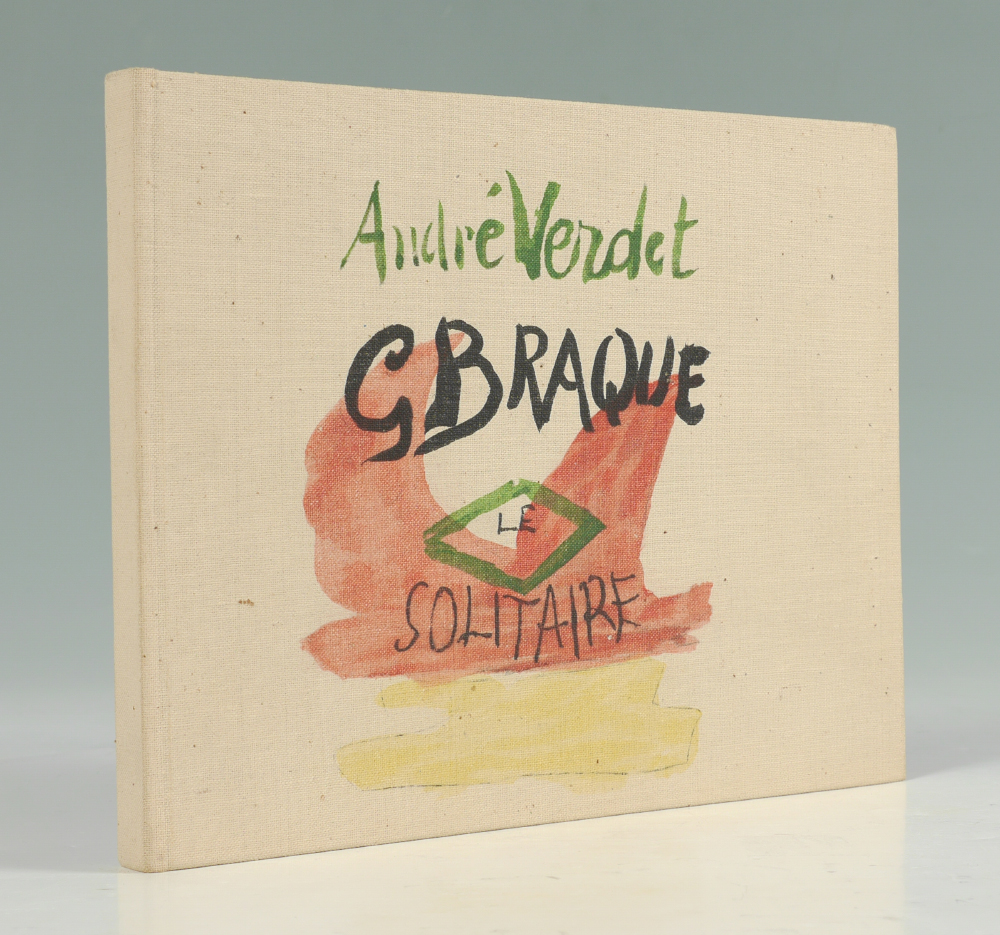 VERDET, Andre, (French, 1913-2004): ''Georges Braque Le Solitaire'', first edition book with 8 color pochoir plates from Braque watercolors, number 880 of 900. Published Paris, 1959, cloth covers, cardboard slipcase. 10'' x 8'' x 3/4''.