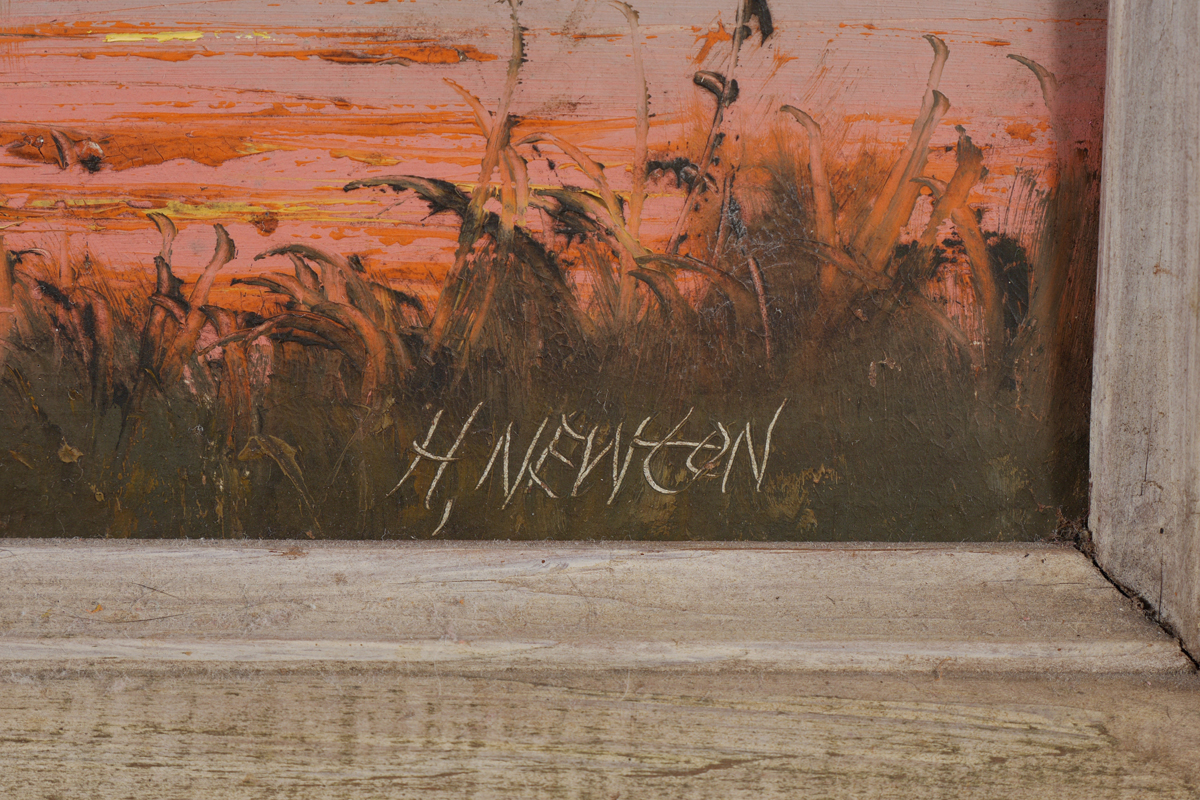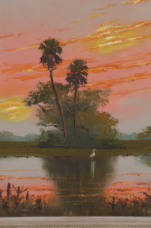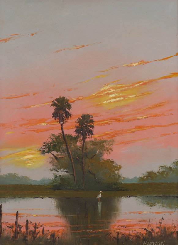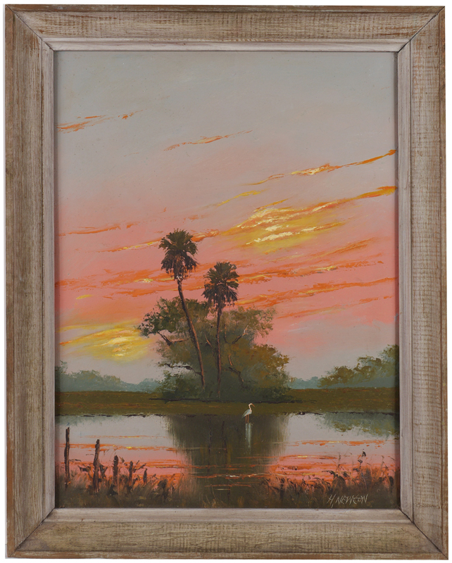 NEWTON, Harold, (American, 1934-1994): Florida Highwaymen fire sky backwaters scene with stand of trees and bird, Oil/Upson, signed lower right, 24'' x 18'', framed 27 3/4'' x 21 3/4''.