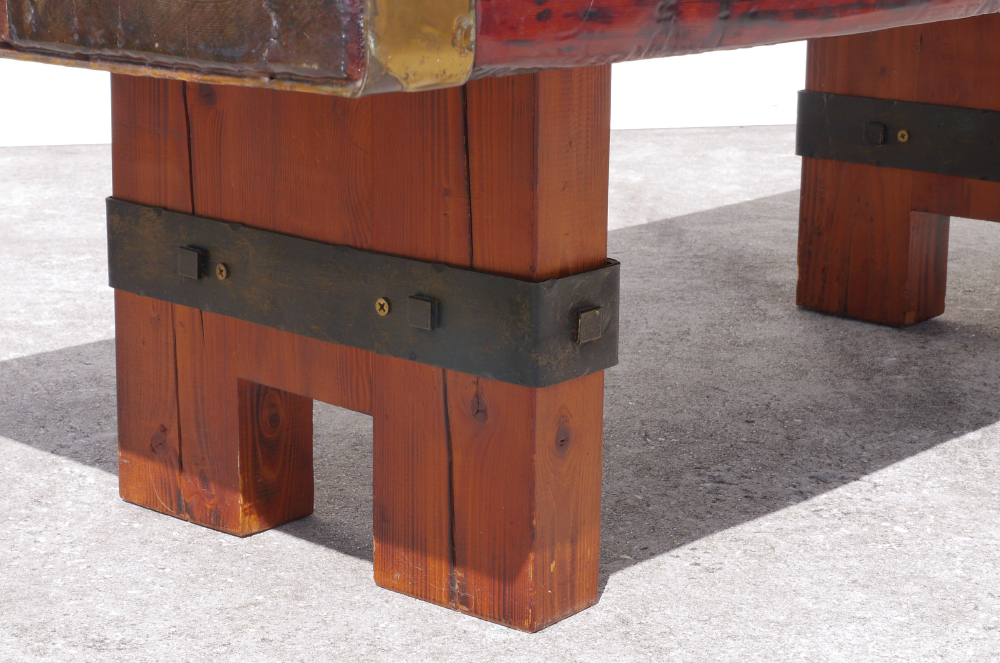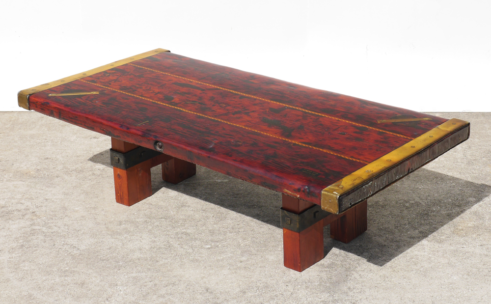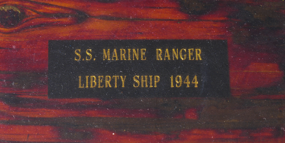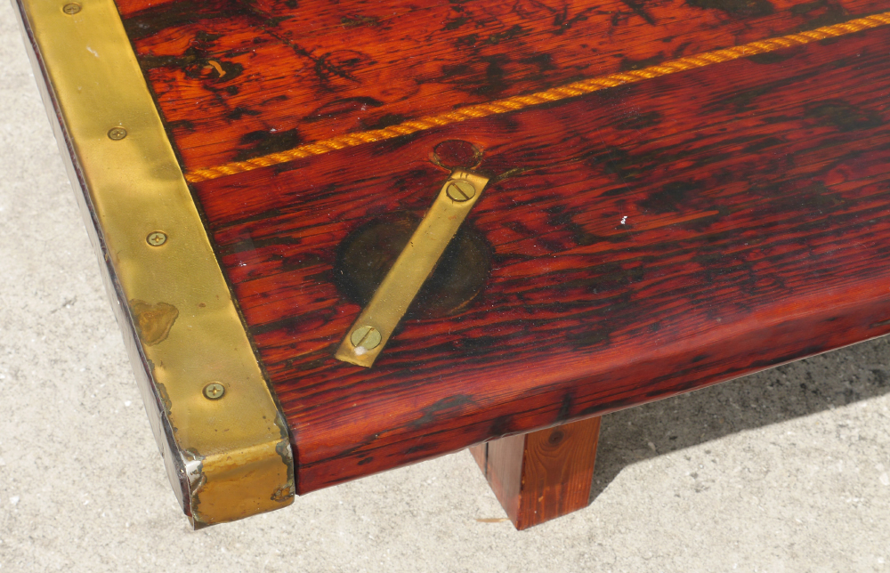 SHIPS DOOR HATCH COFFEE TABLE: Deep clear polyurethane finish over top of door with rope and brass decoration. Plaque under lacquer reads SS Marine Ranger, Liberty Ship 1944. Brass strip ends with patent mark on one. Overall measures 17 3/4'' h. x 59 3/4'' x 29 3/4''.
