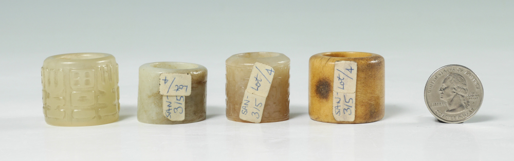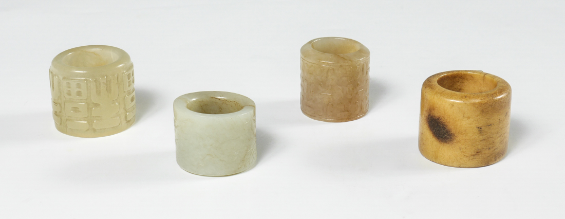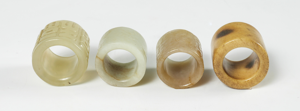 COLLECTION OF 4 CARVED STONE ARCHERS' RINGS: 4 carved jade or similar stone Chinese carved archers' rings, the largest measuring 1'' x 1 1/4'' dia.