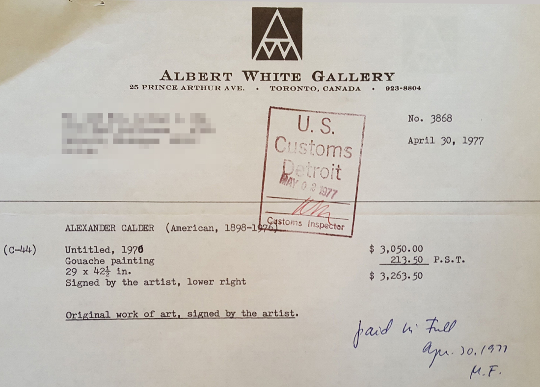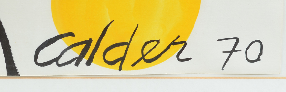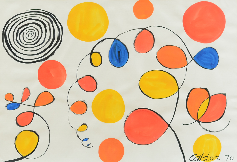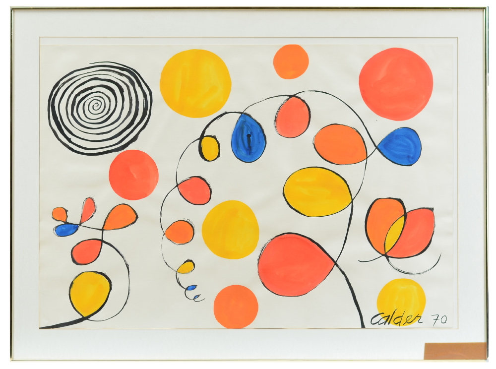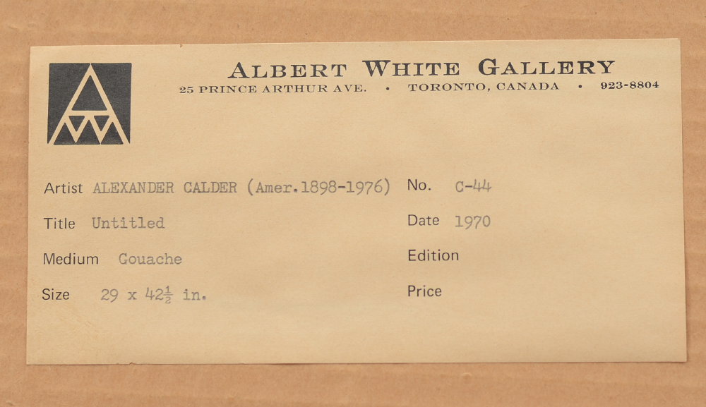 CALDER, Alexander, (American, 1898-1976): Untitled (Spiral and Flowers), 1970, Gouache on Vidalon-les-Annonay Heavy Paper, 29.5'' x 43'', signed lower right, dated '70, metal frame (removed for examination purposes), 37'' x 49'', original Albert White Gallery Toronto, Canada, label affixed verso, blind stamp in lower left corner reads ''Les Papier canson lavis B'', paper is watermarked in the upper margin. Original receipt from 1977, Albert White Gallery, Toronto, Canada. The Calder Foundation has not examined this work yet, but at the conclusion of the bidding, the Winning Bidder may elect to send this piece to the foundation, (after funds have been verified and secured in an escrow account) insured, for immediate examination and registration into the known cataloged works of Calder, (at the Foundations earliest opportunity, which, according to them will be in the next few weeks). Upon conclusion of the examination, if the Calder Foundation finds the work to be authentic, and provides it with an officially documented Calder Foundation identification number (Ex. A13111), the sale will be complete, and the Winning Bidder will make arrangements with the Foundation and a shipper of their choice, to have the item packed, shipped and insured for immediate transport. If the Calder Foundation finds the work to be inauthentic, and/or cannot provide an officially documented Calder Foundation identification number, then the amount of the winning bid verified and secured in an escrow account, is to be returned in full to the Winning Bidder, or the bidder may keep the picture. If the Winning Bidder declines the offer to submit for examination, the sale will become final. By participating in the live online auction bidding for this lot, you agree and are bound by these terms.