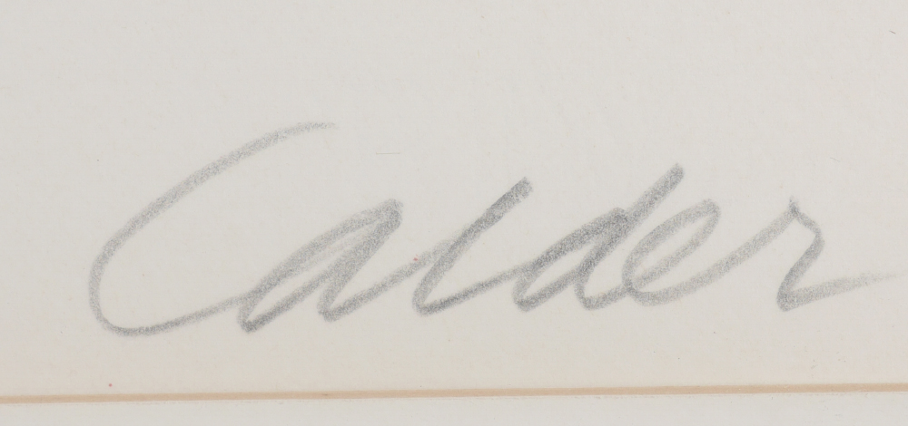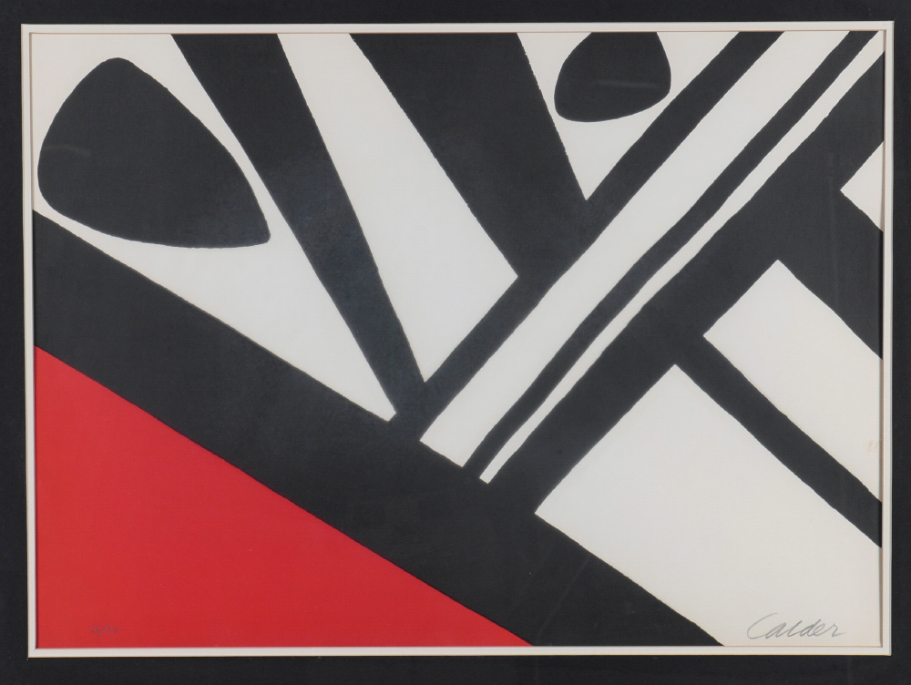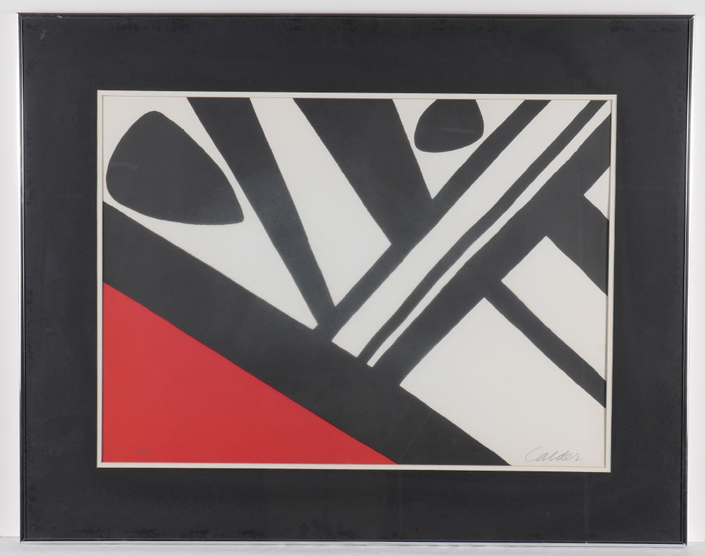 CALDER, Alexander, (American, 1898-1976): ''L'Acier du Constructeur'', Lithograph, sight size 21'' x 28.5'', pencil signed lower right, numbered 56/75 lower left, framed, 30'' x 58''.