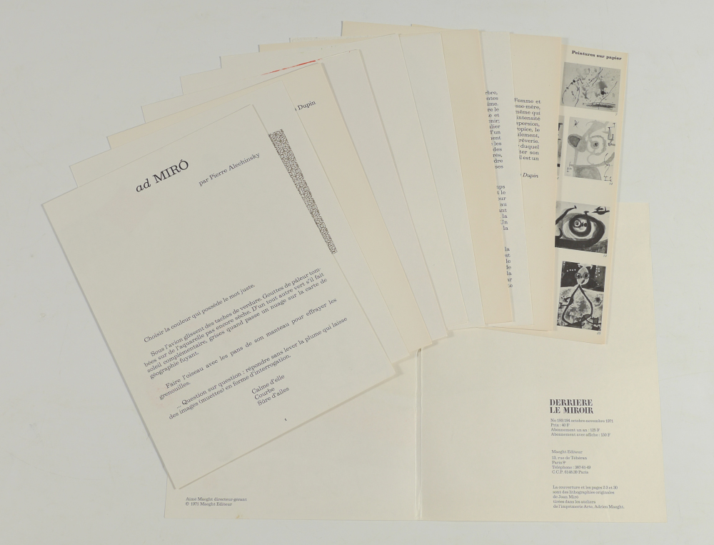 1971 DERRIERE LE MIRIOR JOAN MIRO: 36 pages, cover and index page, lithographs and pictures, published November, 1971, unbound. 15'' x 11''.