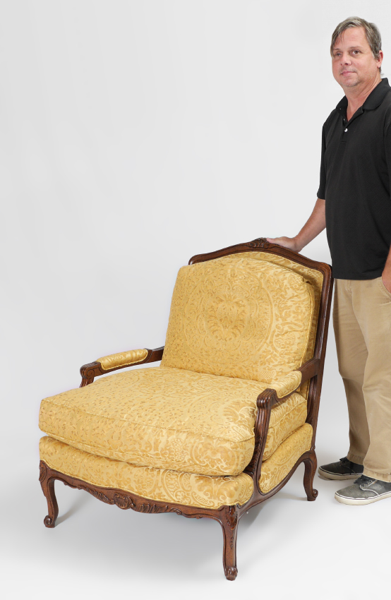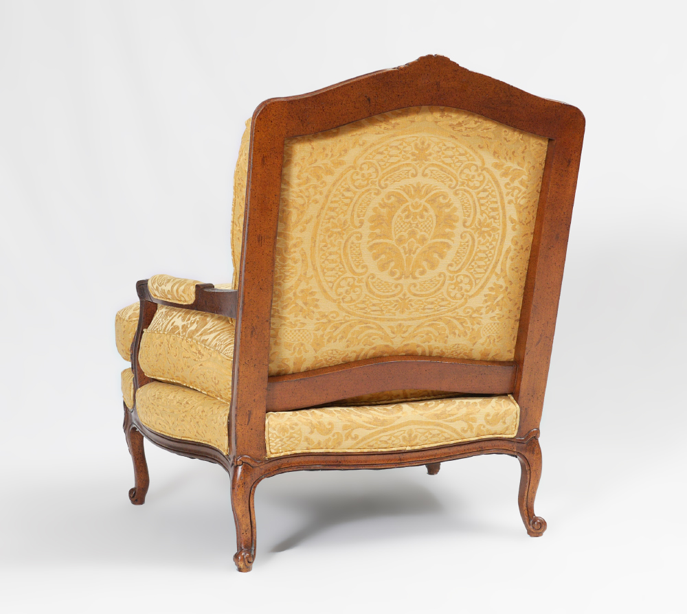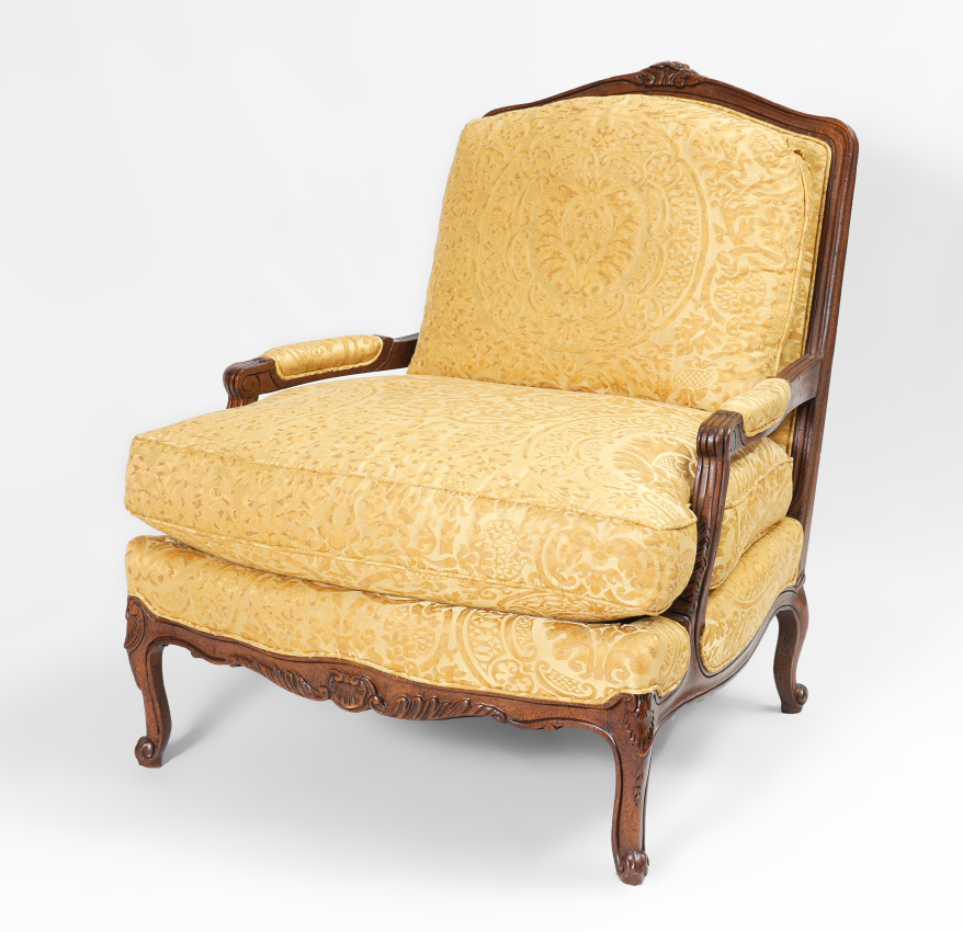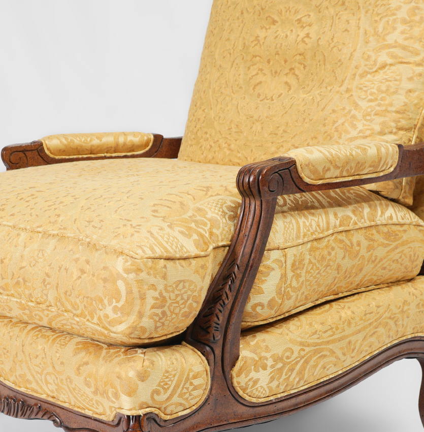 FRENCH CARVED BERGERE ARM CHAIR: Carved and shaped top rail, arms, skirt and legs. Gold foliate motif patterned upholstery, 37 1/2'' h. x 33'' x 34 1/2''.