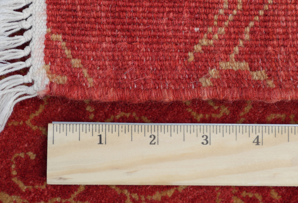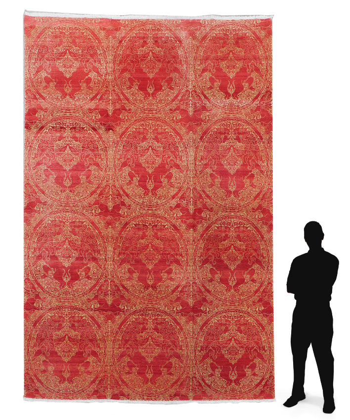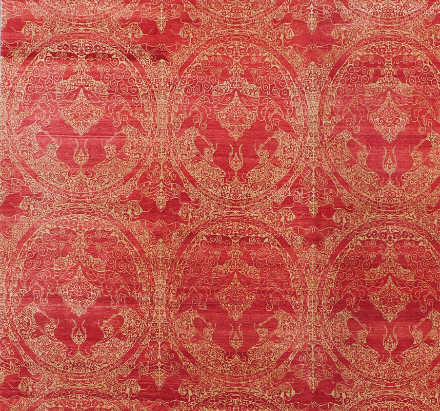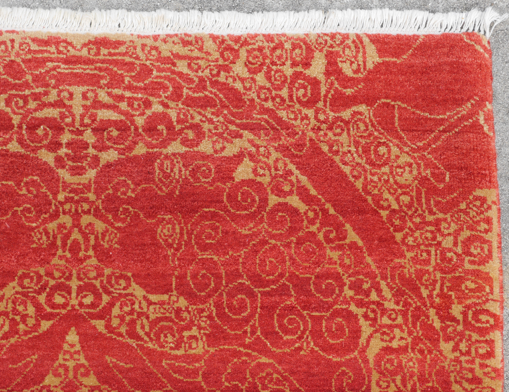APPROX 20-40 YR OLD CHINESE HAND KNOTTED WOOL RUG, 8'9'' x 12'4'': This rug has both an unusual design and coloring. The entire rug has only two main colors, a pale yellow repeating design of facing griffins on a red/rust field. Each pair of Griffins, as a design element, are divided or bounded by circles. Condition is good.