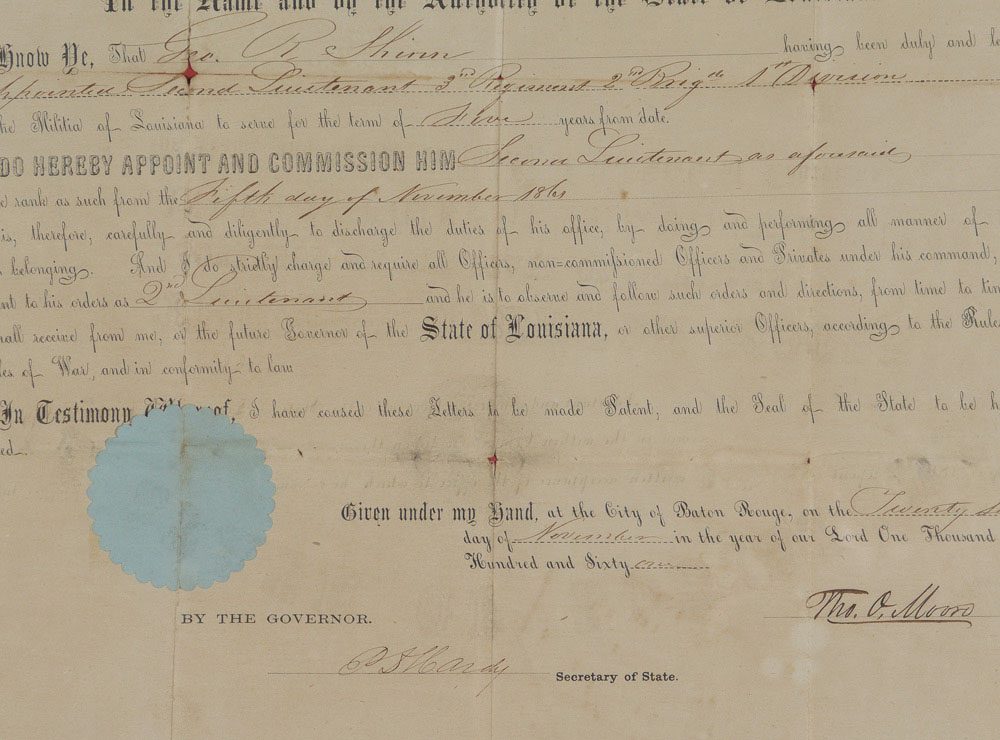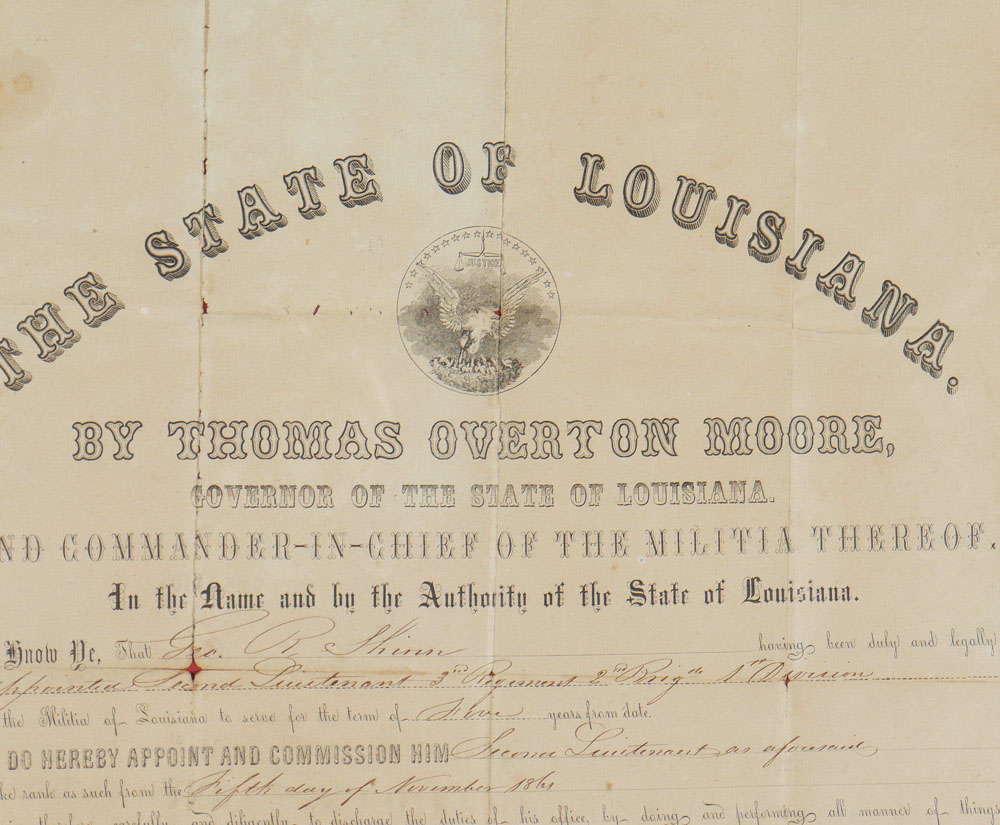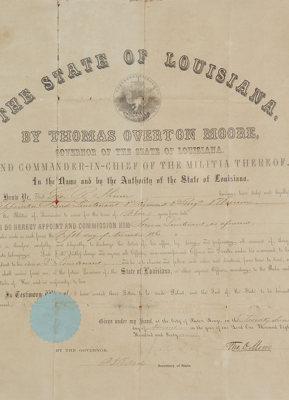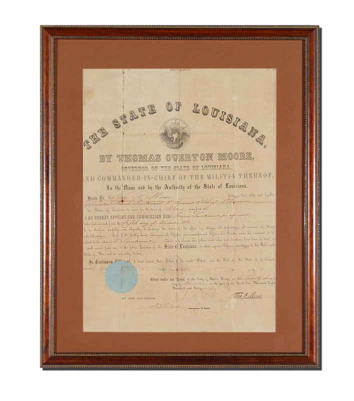 CIVIL WAR CONFEDERATE LOUISIANA MILITIA COMMISSION: 2nd Lieutenant commission to George R. Shinn, Louisiana Militia, 3 Regiment, 2nd Brigade, 1st Division. Dated November 5, 1861, signed by Gov. Thomas Overton Moore, and Pliny D. Hardy, Secretary of State. Sight size 16 1/2'' x 12'', framed under glass 21 5/8'' x 17 5/8''.