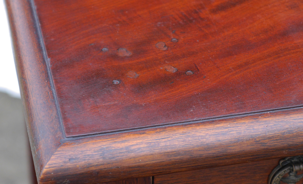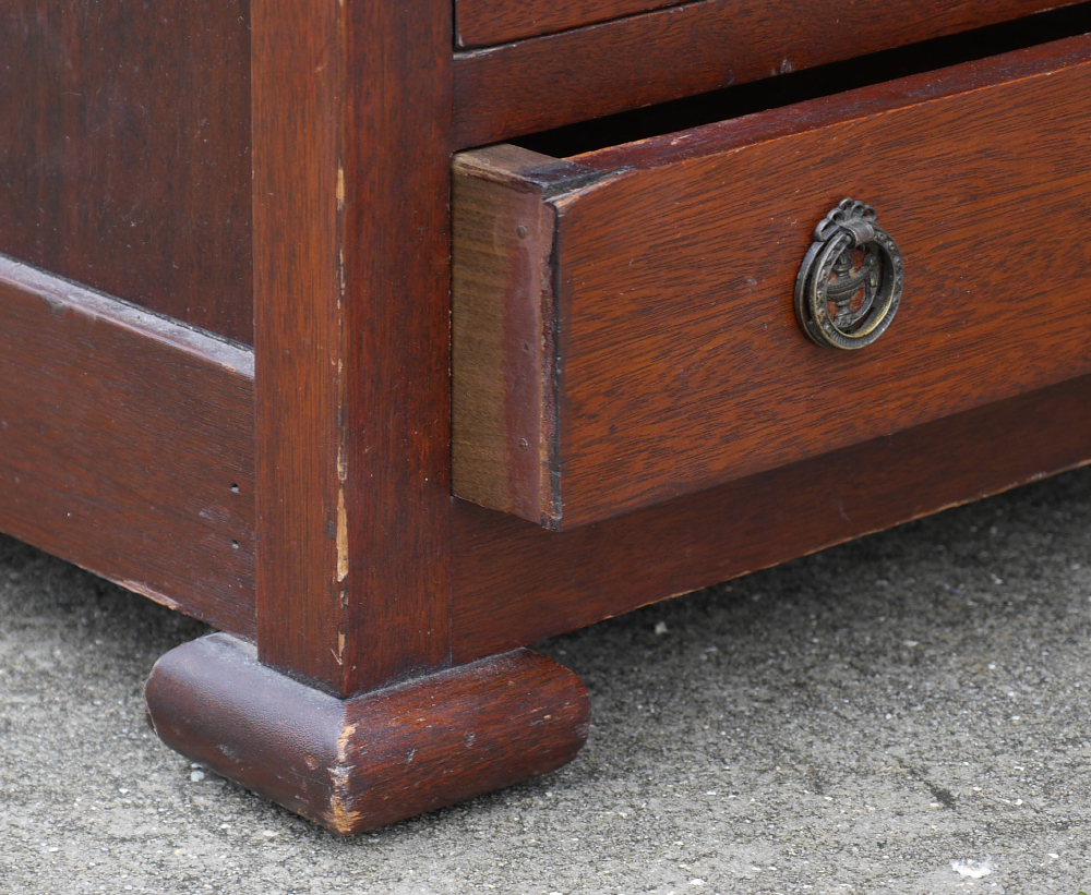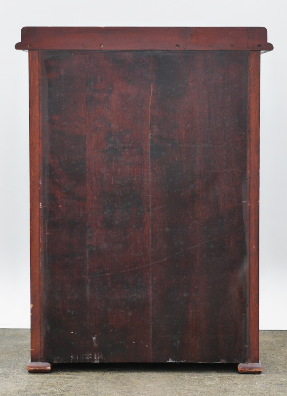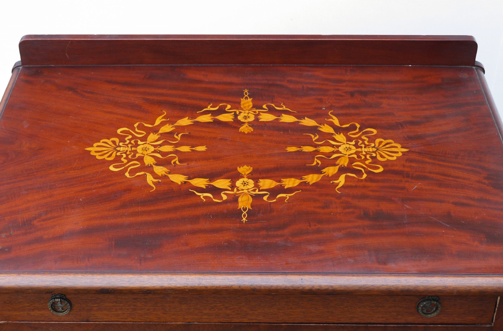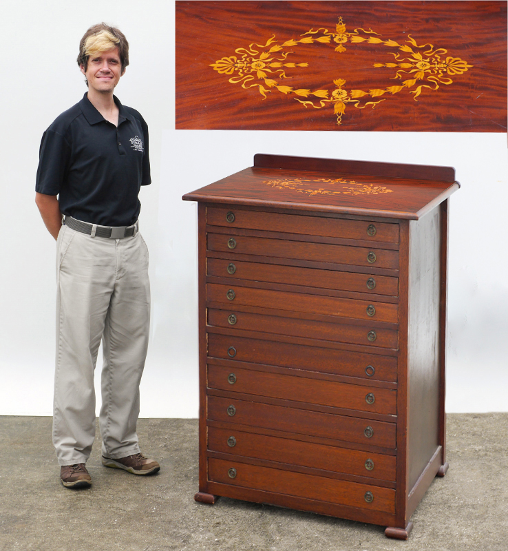 INLAID MIXED WOOD MAP CABINET: Top with inlaid fruitwood floral garland, 10 graduating drawers on 4 feet. Overall measures 49 3/4'' h. x 36 3/4'' x 25 1/2''.