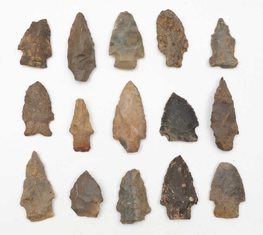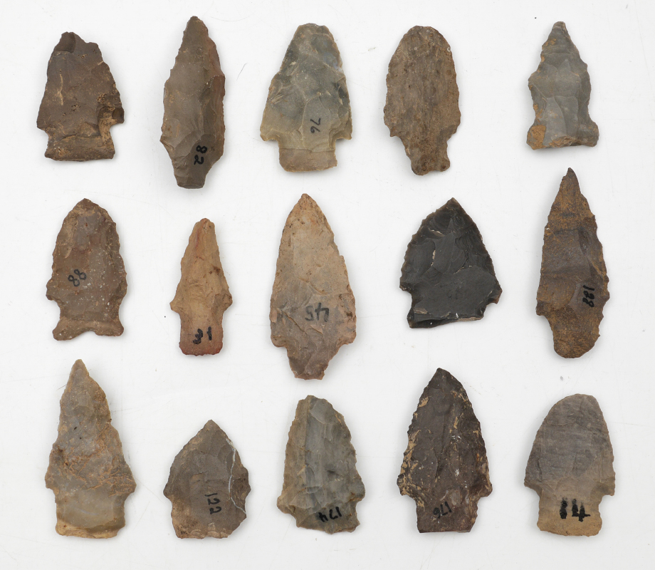 COLLECTION OF 15 PENNSYLVANIA / KENTUCKY ARROWHEADS: Acquired thought the 1950's in various locations around Kentucky and Pennsylvania according to the consignor. Sold as a lot, larges 2 1/2'', smallest 1 3/4''.