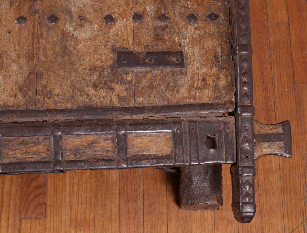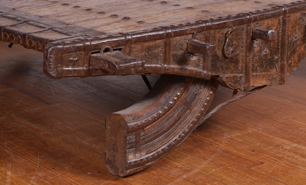 OX CART COFFEE TABLE: Upcycled from the top of a vintage ox cart, wood & iron construction, overall measures 14 1/2''h. x 52'' x 64''.