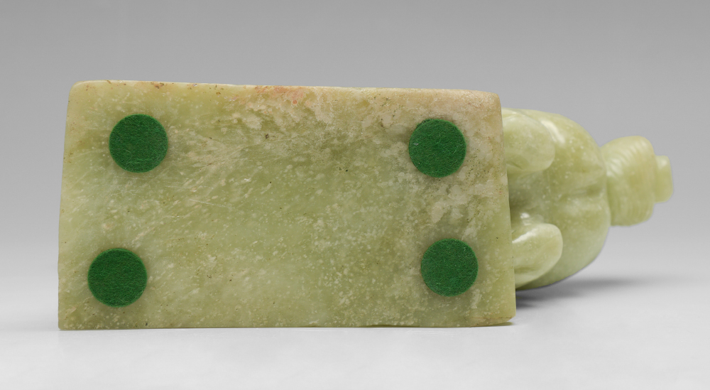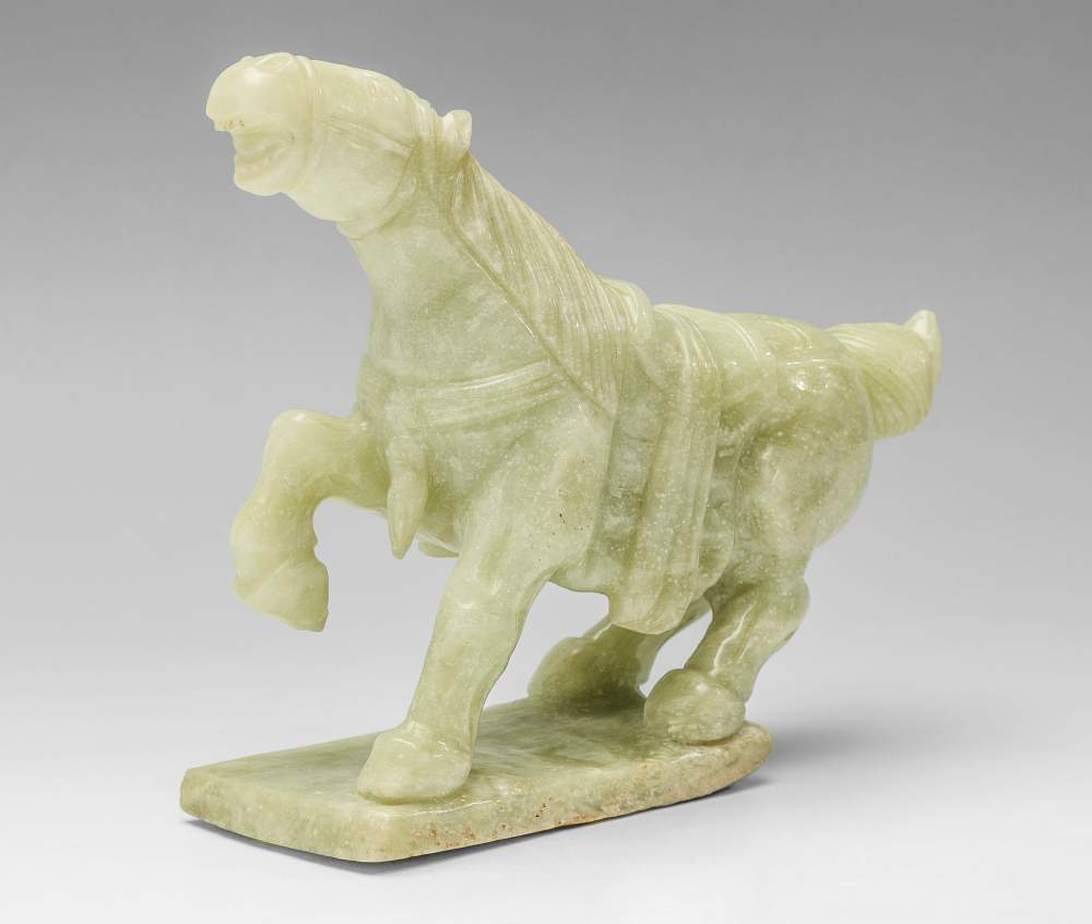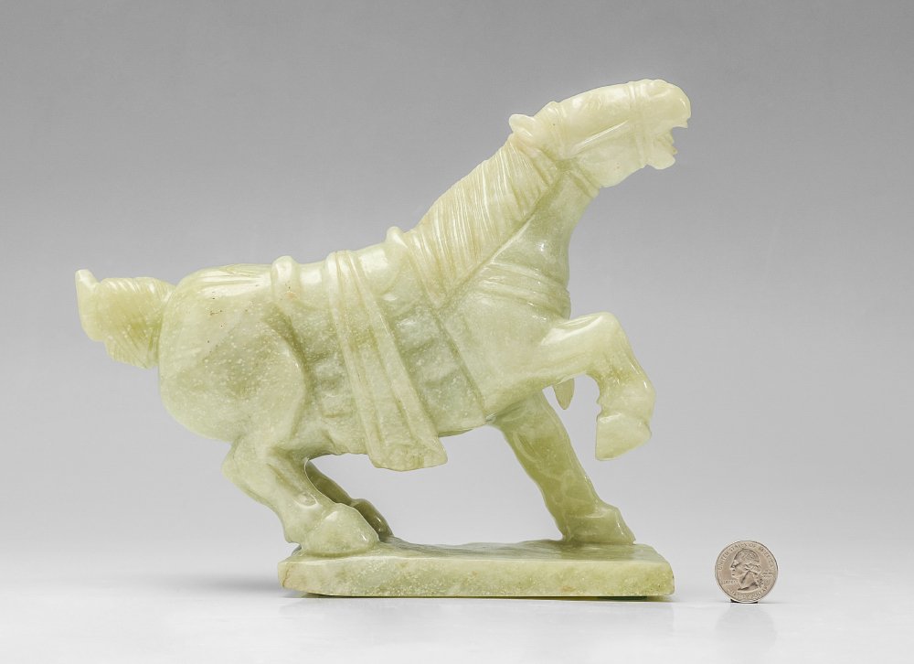 CHINESE CARVED STONE FIGURE OF A TANG HORSE: Carved green stone, age unknown, measures 8 1/4'' h. x 10'' x 3 1/4''.