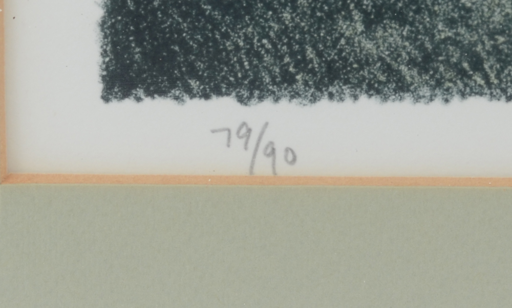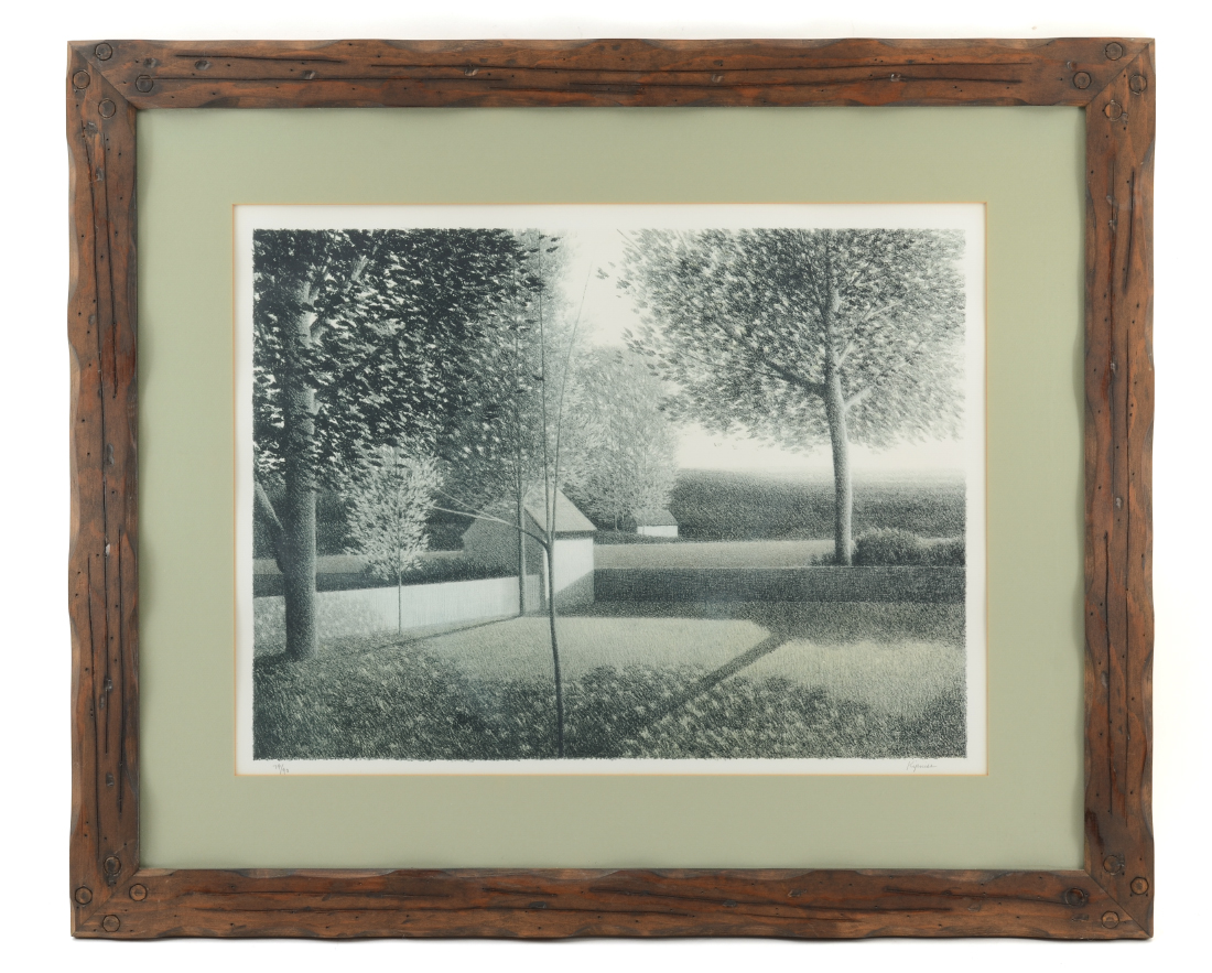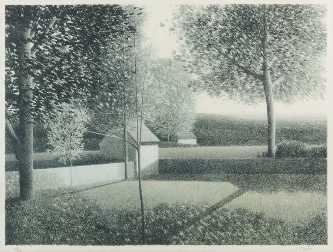 KIPNISS, Robert, (American, 1931-): Backyard Scene with Sheds, Lithograph, sight size 16'' x 21.75'', pencil signed lower right, numbered 79/90 lower left, custom wood frame, 25.5'' x 30''.