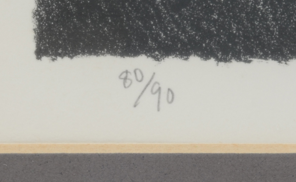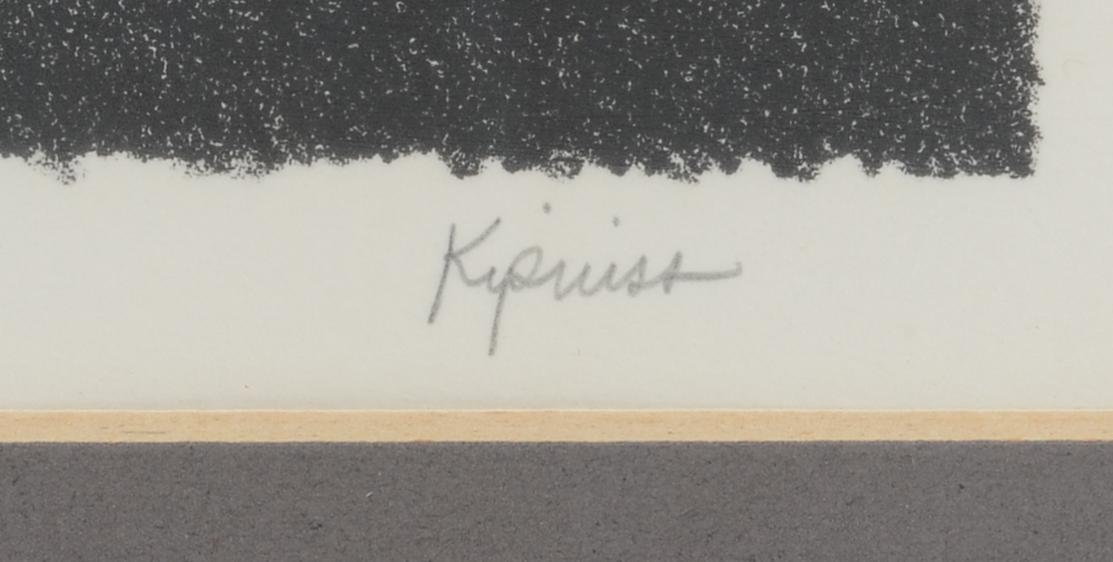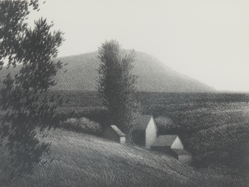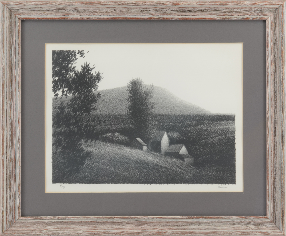 KIPNISS, Robert, (American, 1931-): Landscape with Hilltop and Barn Structures, Lithograph, sight size 11'' x 14'', pencil signed lower right, numbered 80/90 lower left, wood frame, 17.5'' x 20.75''.