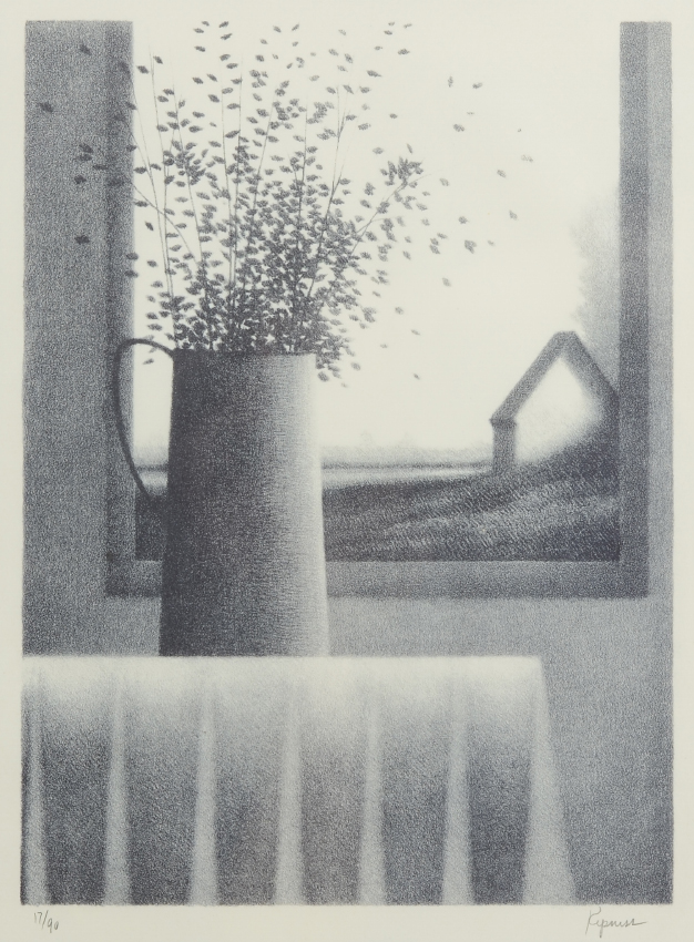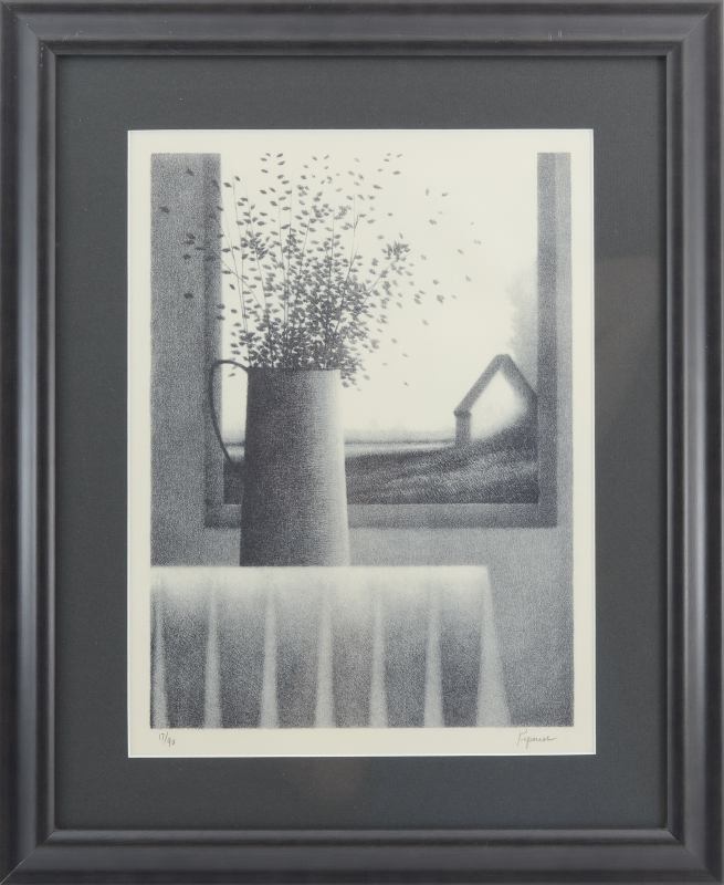KIPNISS, Robert, (American, 1931-): Still Life with Pitcher and Wild Flower Bouquet on a Windowsill with Barn in the distance, Lithograph, sight size 14.5'' x 11'', pencil signed lower right, numbered 17/90 lower left, framed, 20.5'' x 17''.