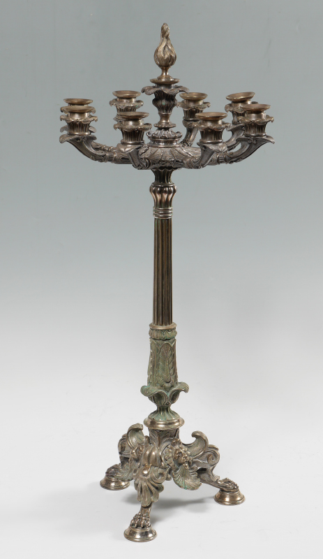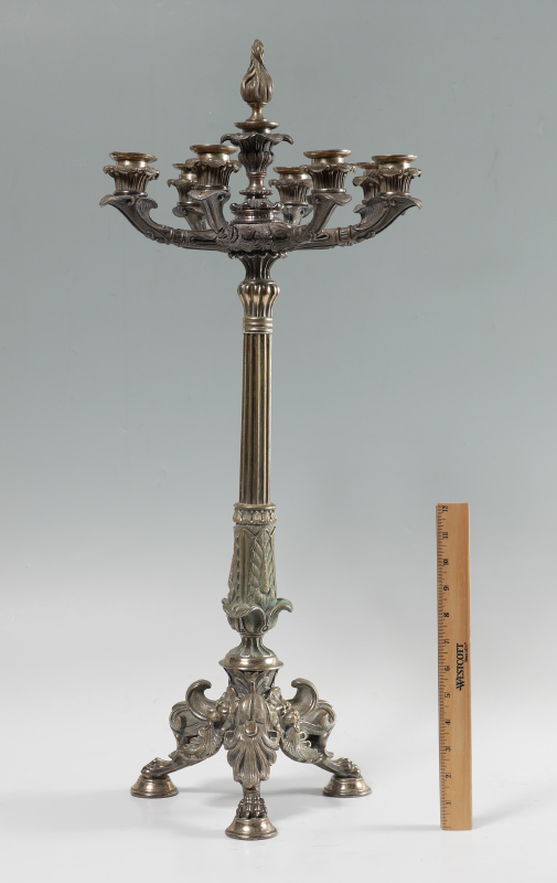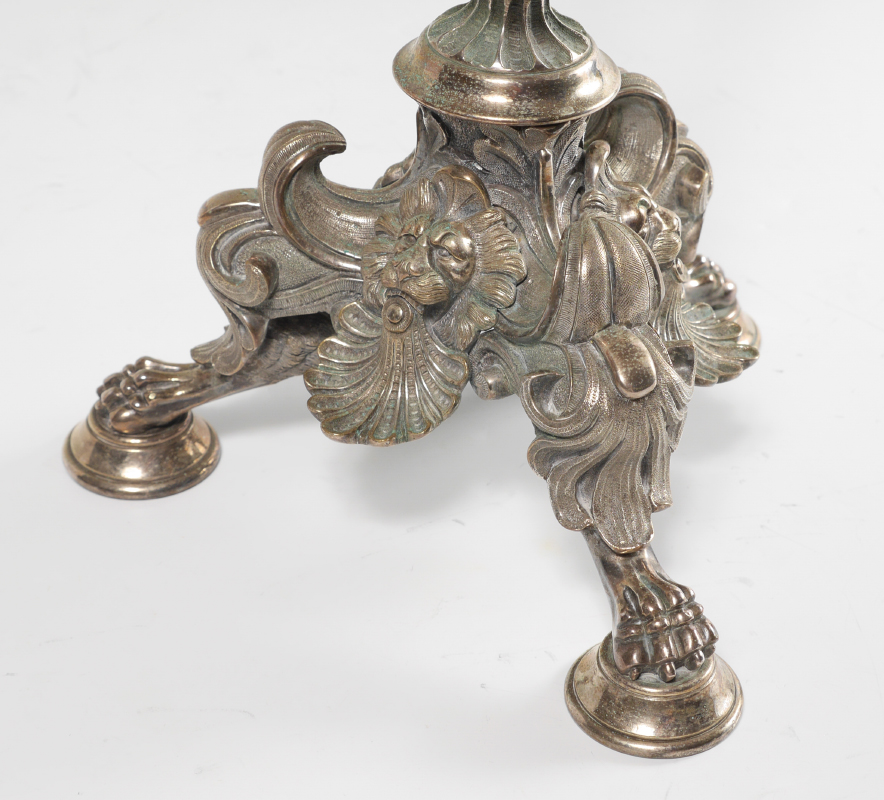 CONTINENTAL SILVERPLATE 8 LIGHT CANDELABRUM: Heavy ornately cast in the rococo style, 8 arm candle holders with center flame finial, fluted column over 3 splayed feet with lion masqueron and shell motifs. No visible mark, 30'' h. x 13'' dia.