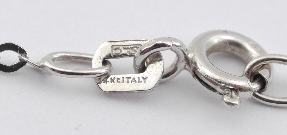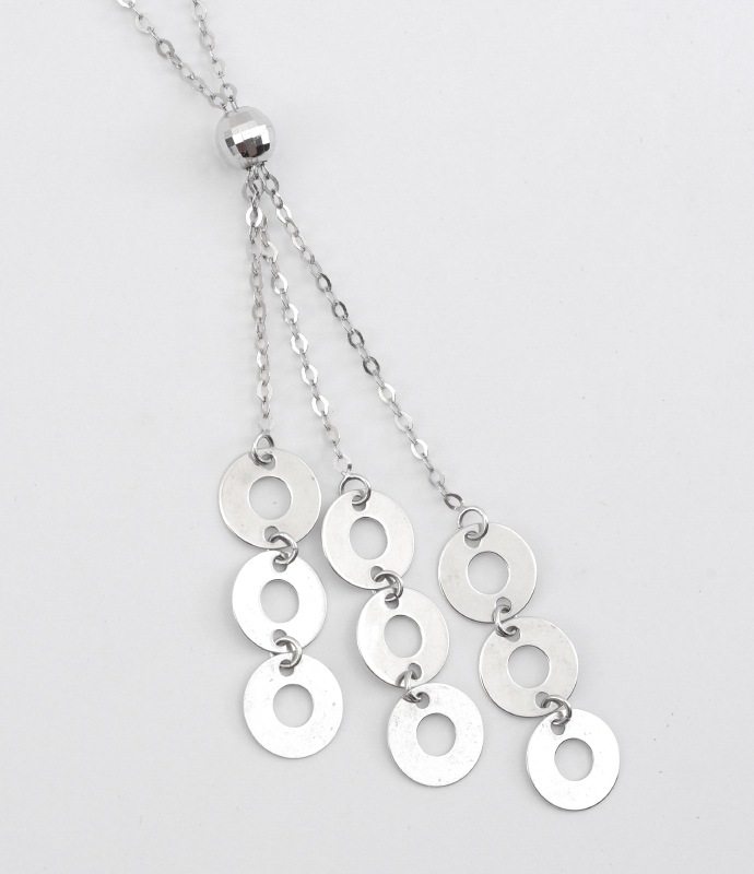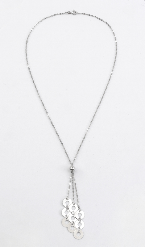 BULGARI STYLE 19'' NECKLACE: Reminiscent of Bulgari with 14K white gold circles on a Bolo style chain. Weight 4.5 grams.