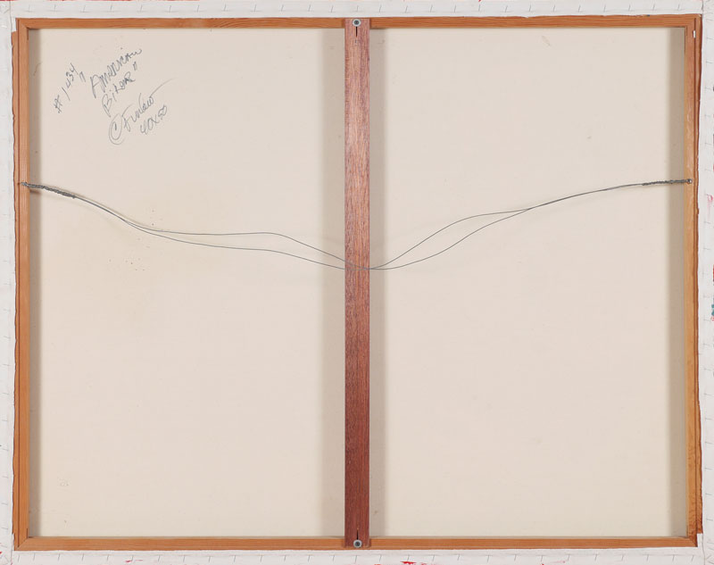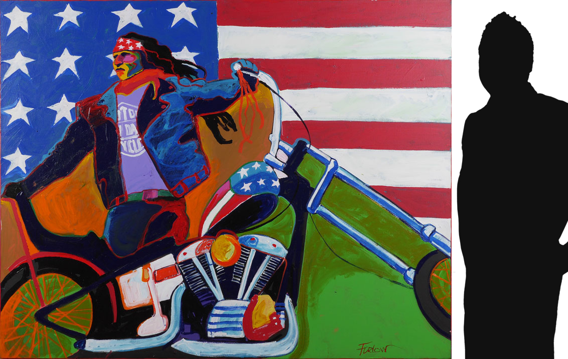 FURLOW, Malcolm, (American, 20th C): ''American Biker'', Acrylic/Canvas, 40'' x 50'', signed lower right, titled and signed verso, numbered 1434, unframed. Furlow may have been discouraged as an artist by his college art professor who disapproved of his style - so Furlow left college to become a rock and roll musician playing back up for groups, such as the Beach Boys, for 18 years. He learned to appreciate strong colors as a one-time designer of movie sets for Disney. Eventually he returned to his love of painting and as an artist and has sold out over 50 one-man shows. His work is held in public and private collections around the world. He is recognized by many as a ''Renaissance Man'' and a ''living legend'', particularly with regards to painting the American Southwest.