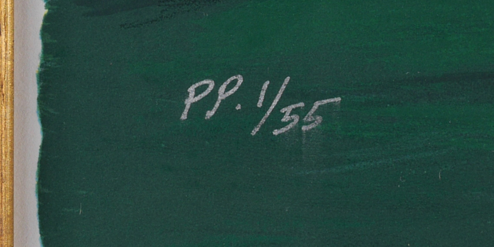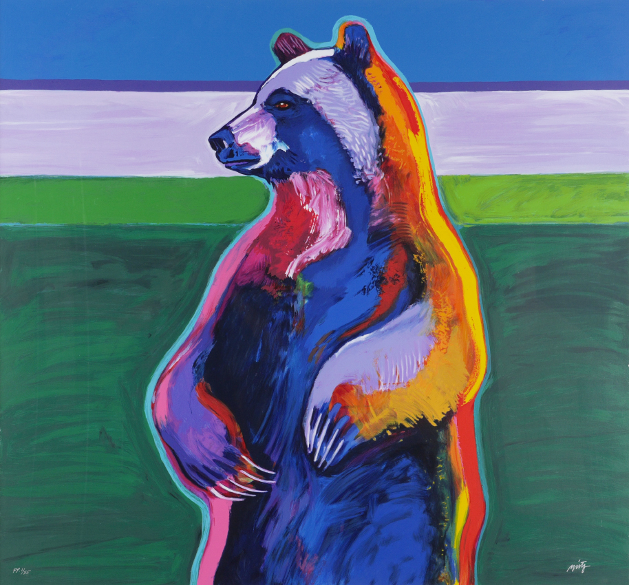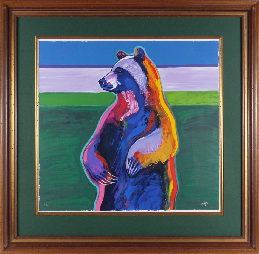 NIETO, John, (American, 1936-): Standing Grizzly, Serigraph, sight size 31'' x 33'', signed lower right, marked lower left PP (Printers Proof) and numbered 1/55, custom wood frame, 25.5'' x 47''. Nieto's works are exhibited globally and in the Presidential Library. His works are painted in brilliant colors and are represented as warriors, potters and in other roles and are represented in brilliant garb.