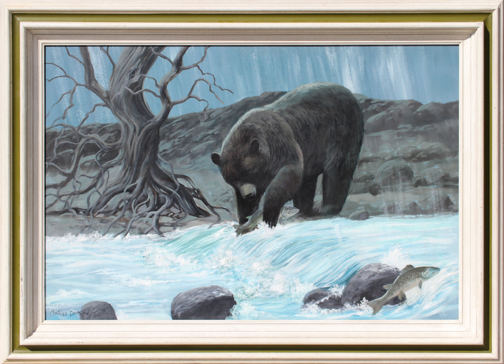 DAMROW, Charles, (American, 1916-1989): Grizzly Bear Trout Fishing, Oil/Masonite, 24'' x 36'', signed lower left, framed, 31'' x 43''.