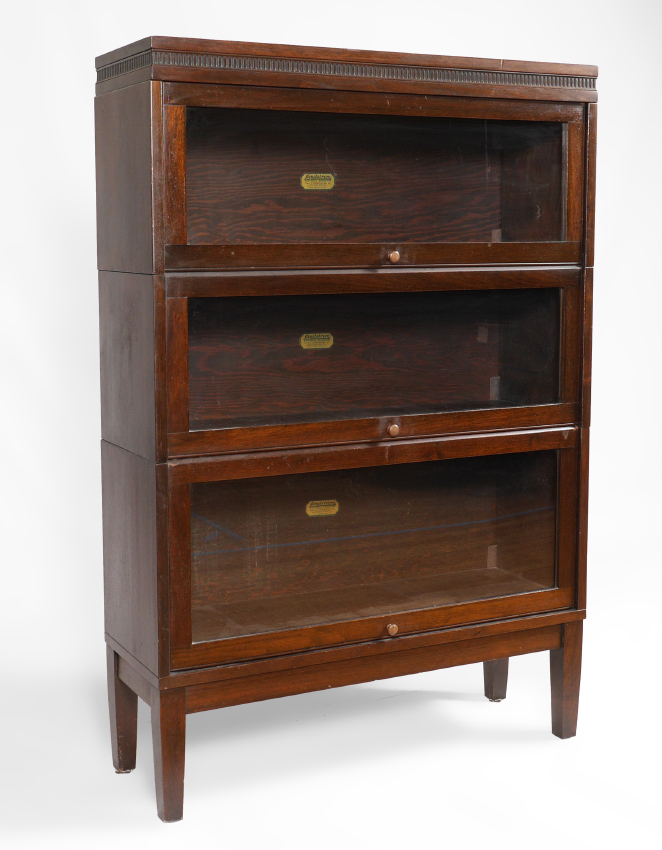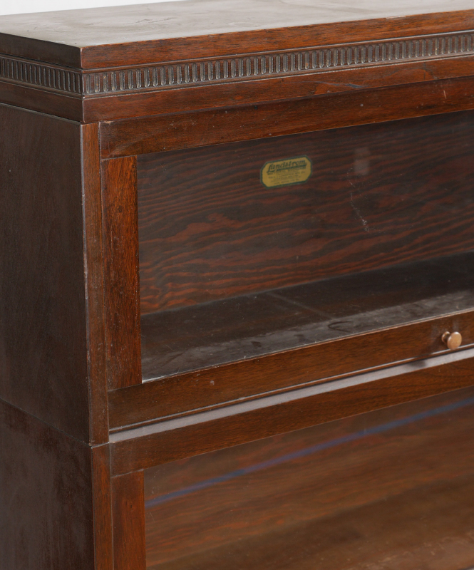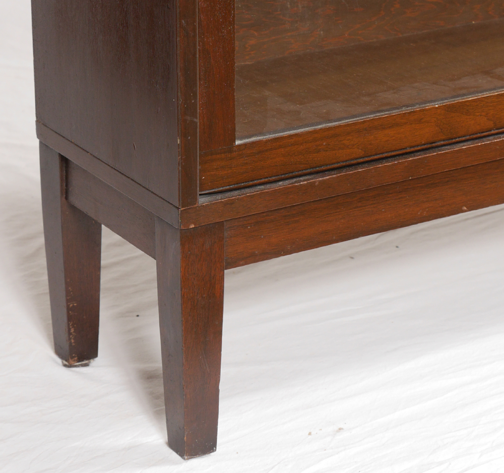 LUNDSTRUM SECTIONAL STACKING BOOKCASE: 3 section lawyer stacking bookcase with overlapping pivoted glass doors, mahogany veneer, marked with Lundstrum label. Overall with top and base 49'' h. x 33 3/4'' x 11''.