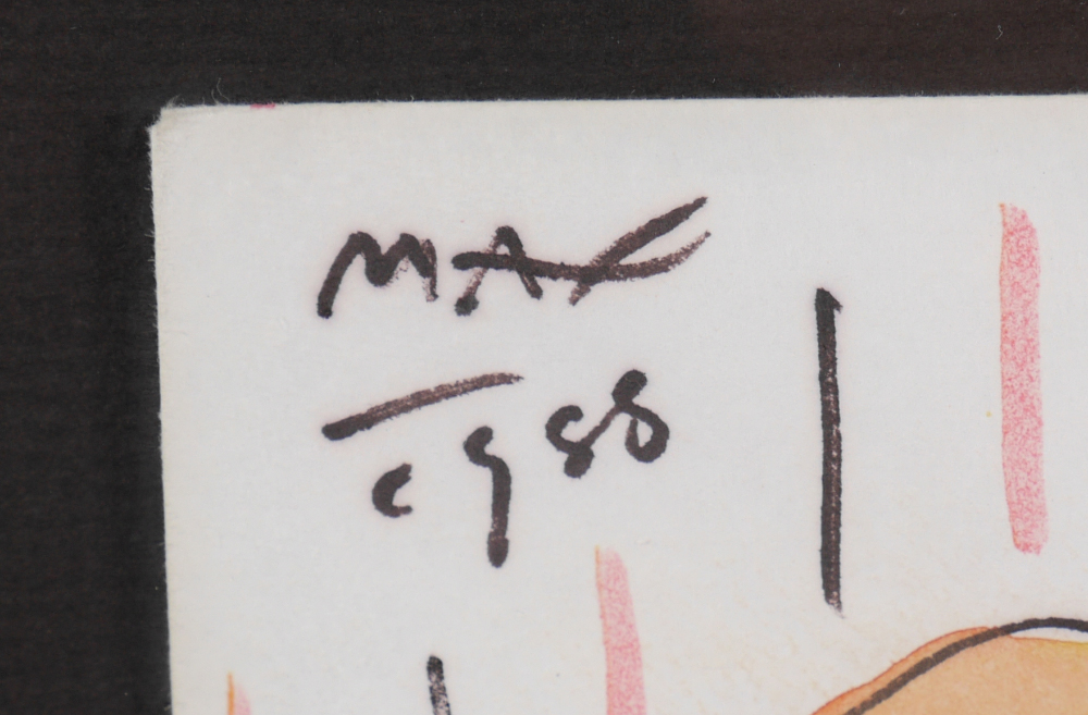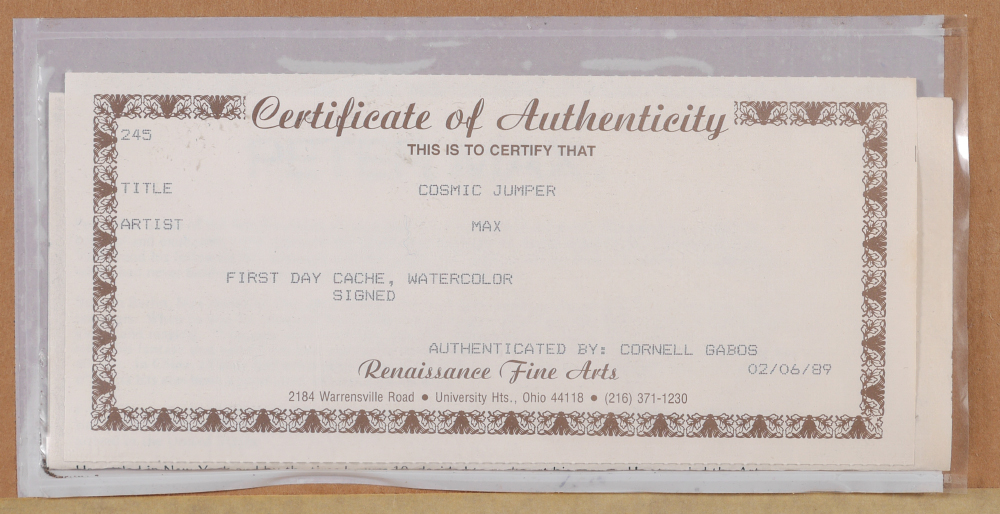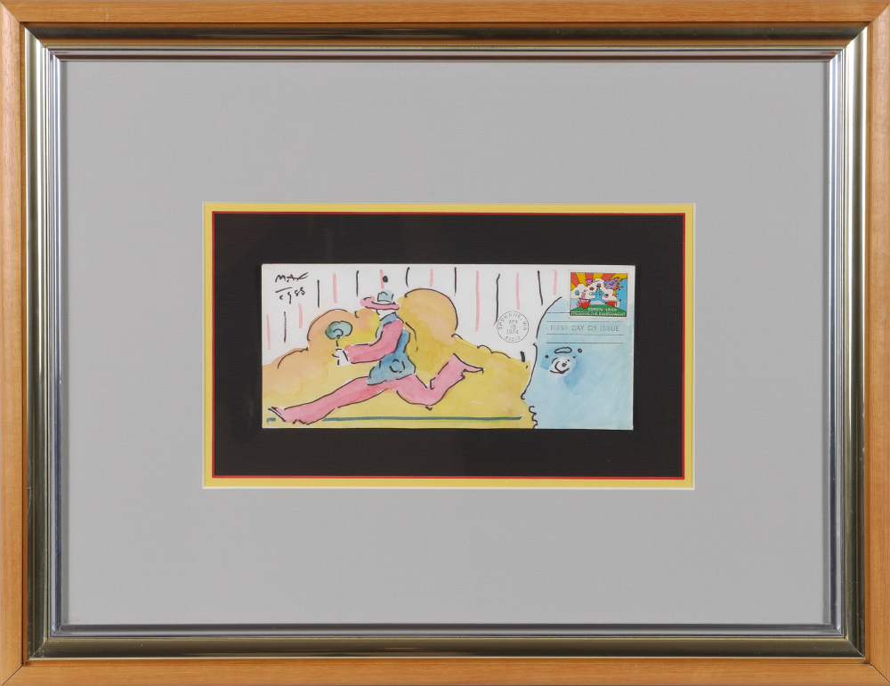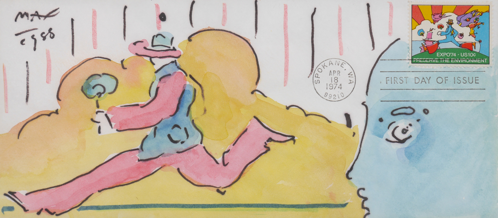 MAX, Peter, (German, 1937-): Cosmic Jumper, 1st Day Cache, Watercolor on Envelope with Expo '74 1st day issue stamp affixed, 4.25'' x 9.5'', signed upper left and dated 1988, framed, 17.25'' x 22.5''