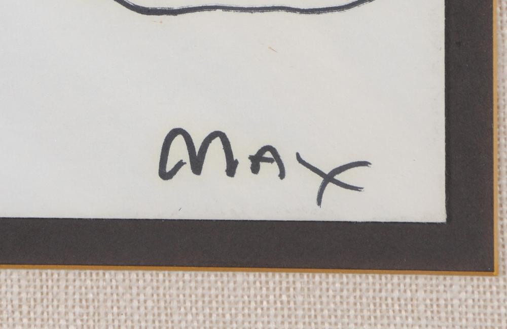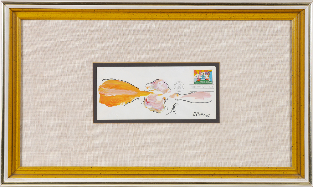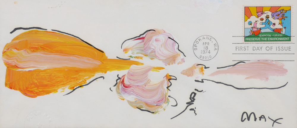 MAX, Peter, (German, 1937-): Landscape, Acrylic on Paper Envelope, 4.25'' x 9.5'', signed lower right, 1st day issue canceled stamp affixed to envelope from Expo '74 Preserve the Environment. Float mounted in frame, 15'' x 24.75'', Peter Max blind stamp lower left.