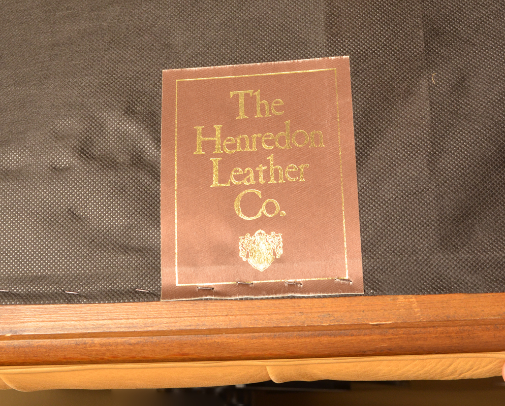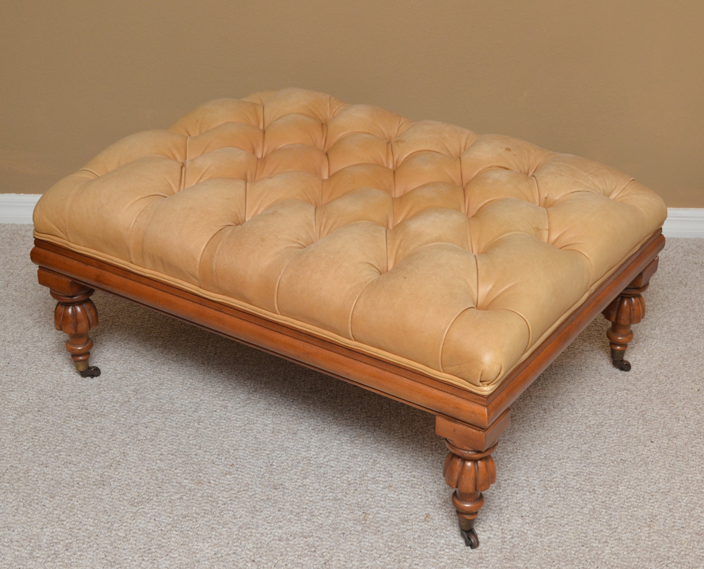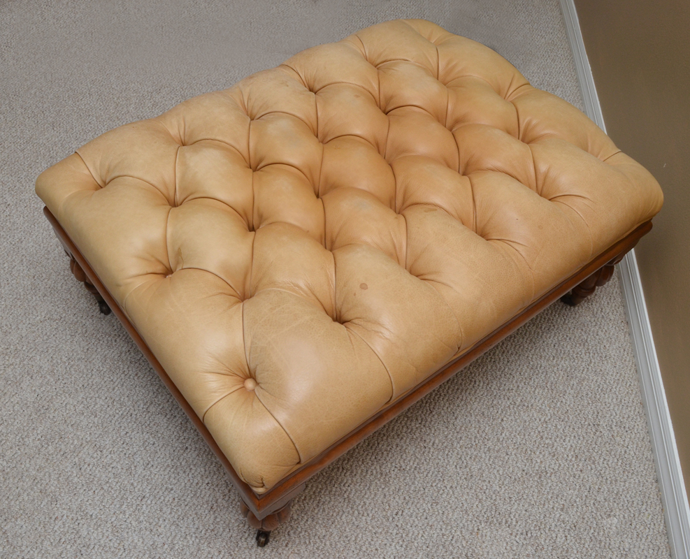 HENREDON OVERSIZED TUFTED LEATHER OTTOMAN: Tan tufted soft leather cushion top, carved and turned legs on castors, Henredon label. Overall measures 18 3/4'' h. x 40 1/2'' x 30''.