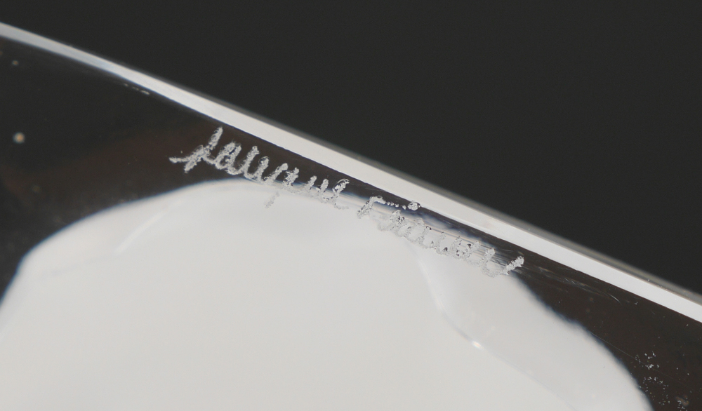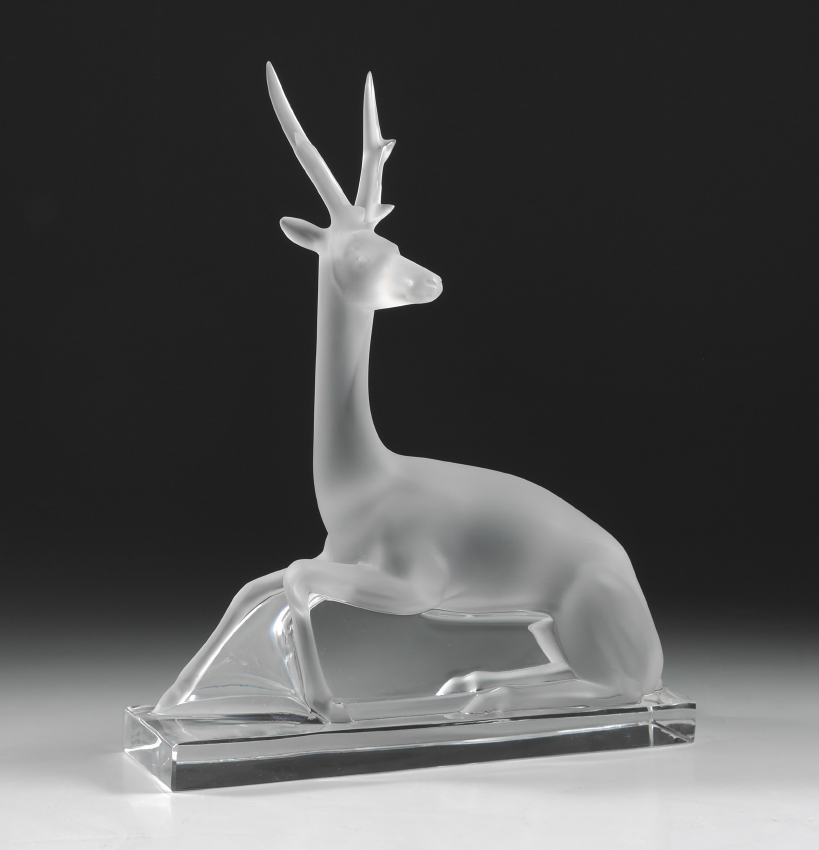 LALIQUE CRYSTAL STAG DEER FIGURINE: Frosted deer on clear crystal base, signed Lalique France, 10 1/8''h. x 8.25'' x 2 7/8''.
