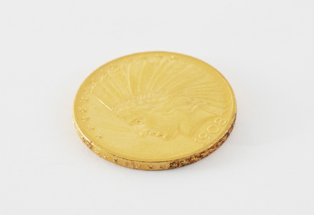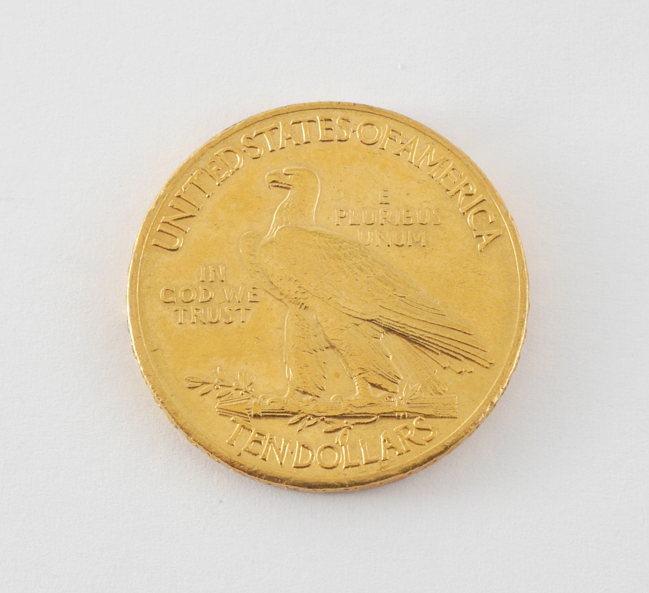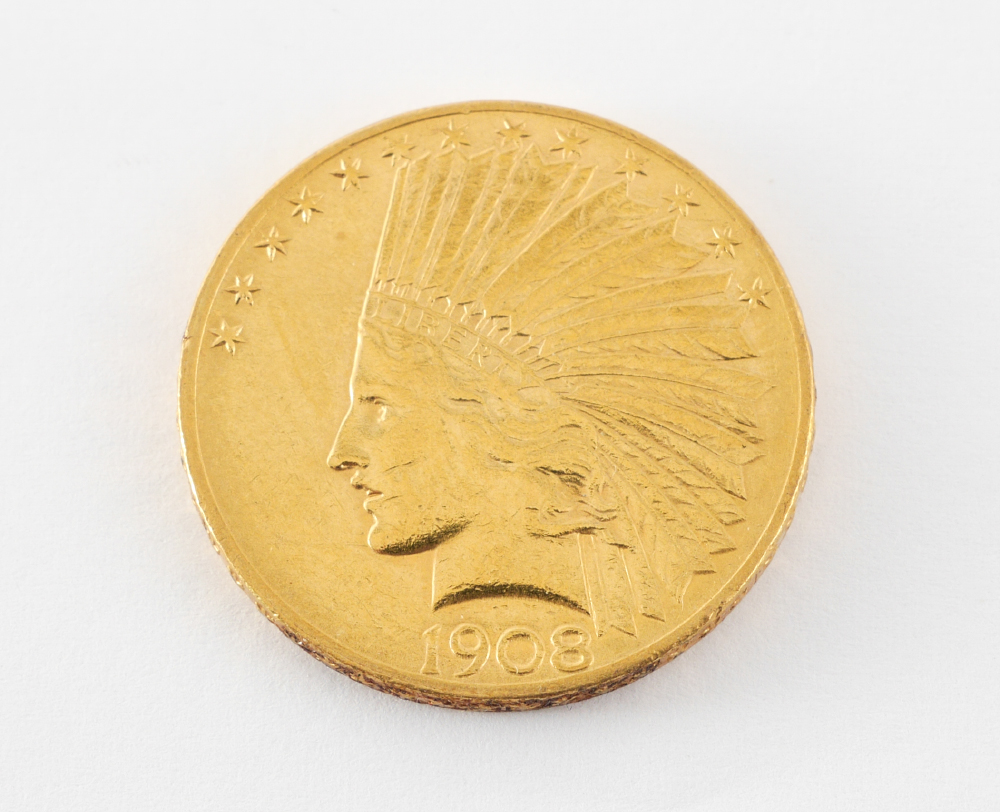 1908 INDIAN HEAD $10 US GOLD COIN: 1908 with motto, ungraded, approx. 16.7 grams .900 gold.