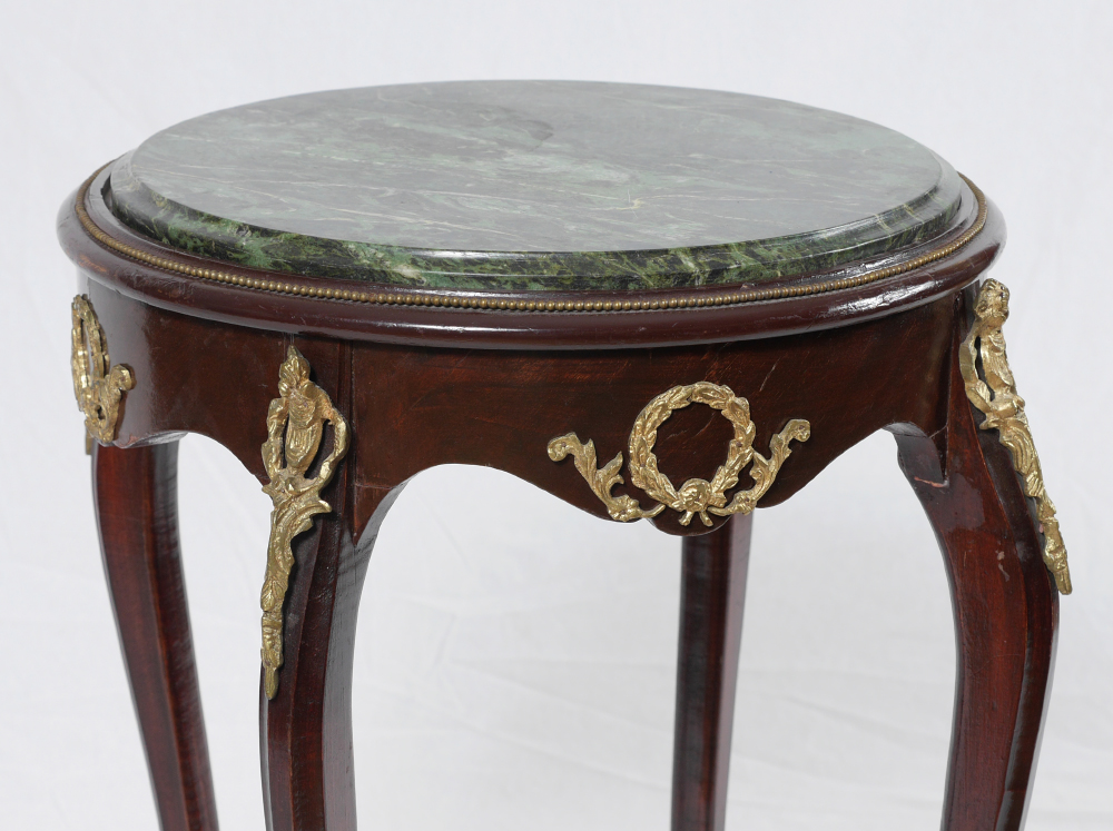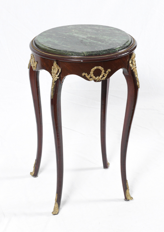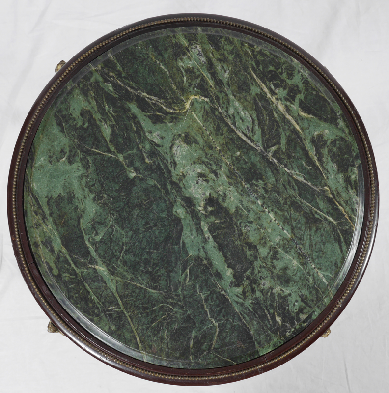 FRENCH MARBLE TOP PLANT STAND: Green variegated inset marble top, shaped skirt with applied gilt metal mounts, tapered shaped legs. Overall measures 29 1/2'' h. x 21 1/2'' dia., marble 16 1/2'' dia.