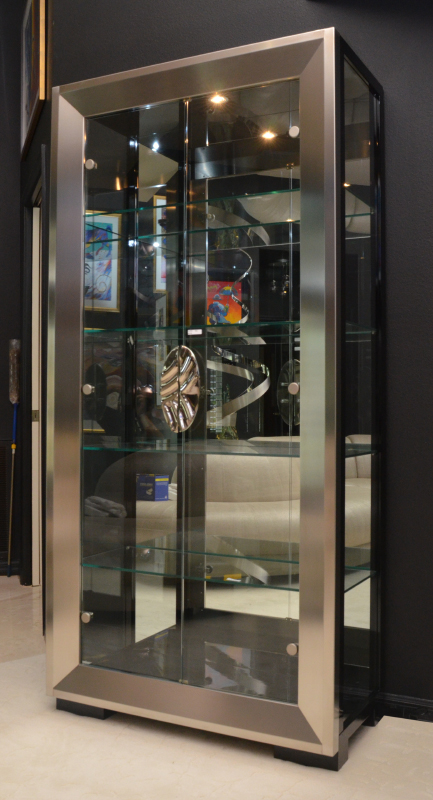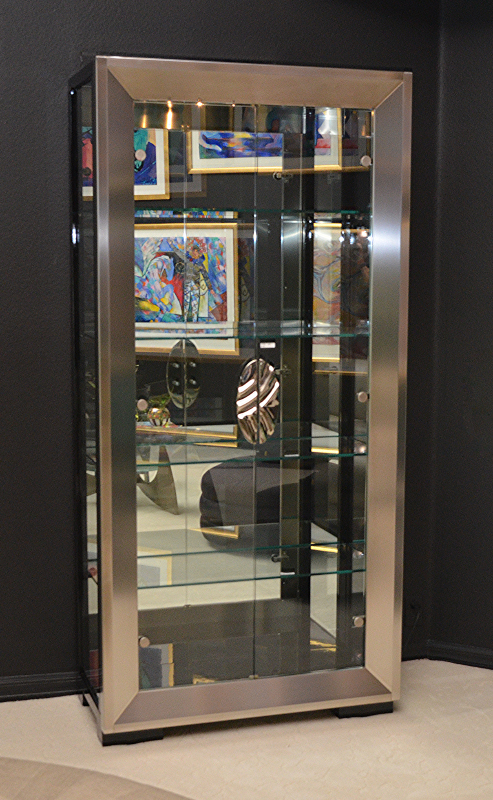 ITALIAN ILLUMINATED CURIO DISPLAY CABINET: Made exclusively for Excelsior, silvered metal framed front doors with abstract metal handles, black metal framed sides and back. 4 glass shelves, 79.25''h. x 37.75'' x 19''.