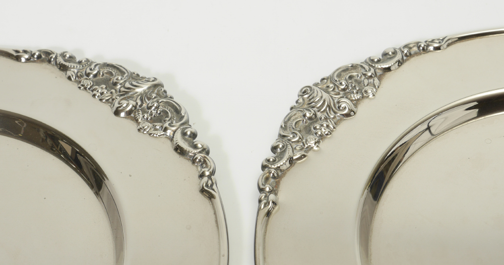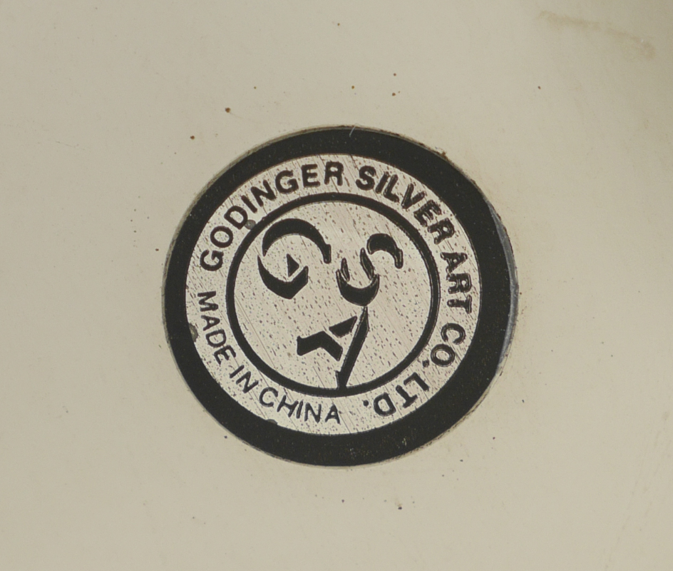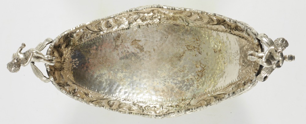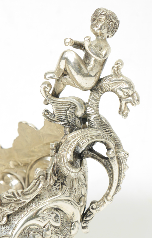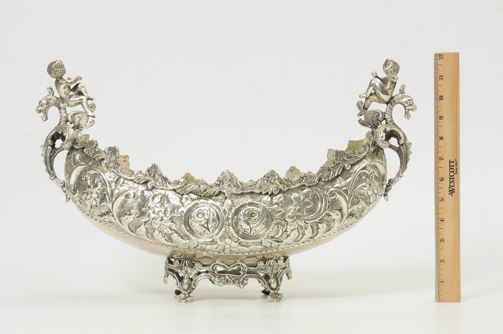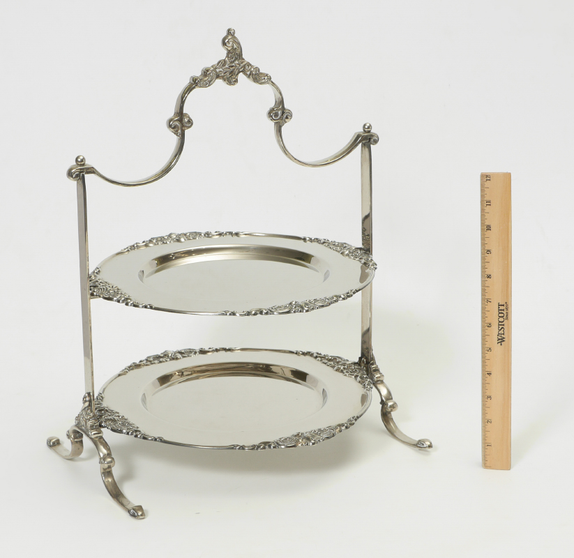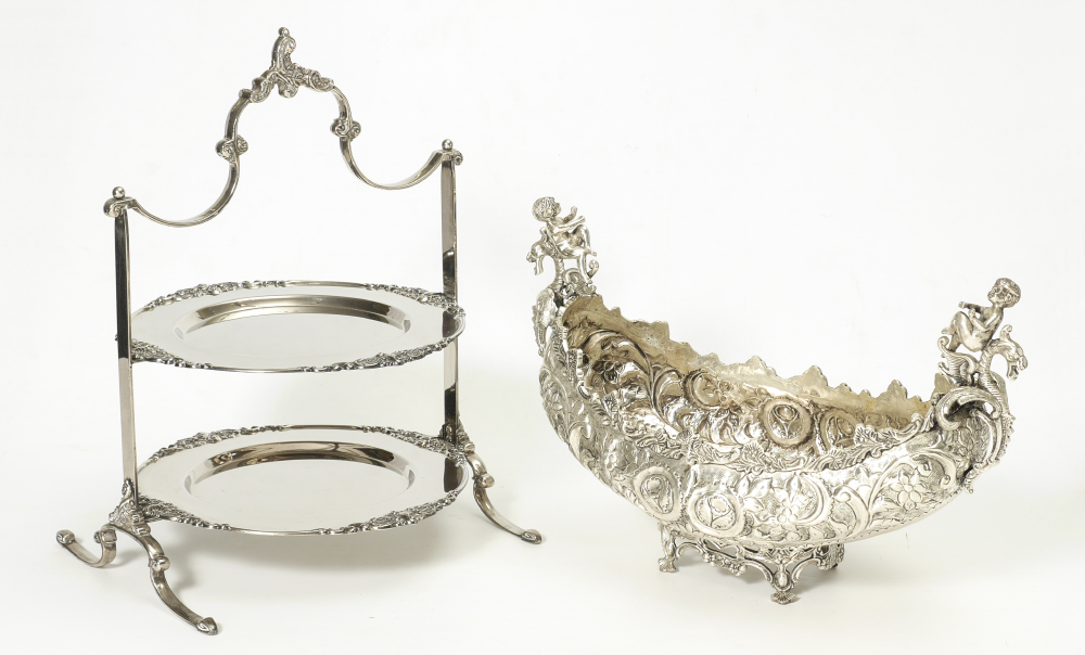 2 PIECE SILVERPLATE SERVING PIECES: 2 pieces total to include 1) Contemporary embossed centerbowl with figural putti on dragon handles, no markings, 12 1/4'' h. x 19'' x 9 1/4''. 2) 2 tier Godinger hor d'oeuvers stand, 18'' x 13 1/4'' x 10 1/2''. Plates 12 1/2'' dia.