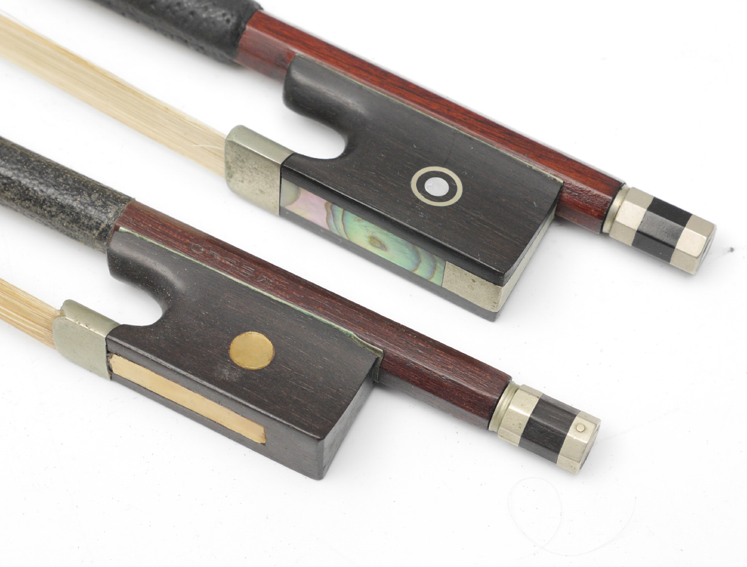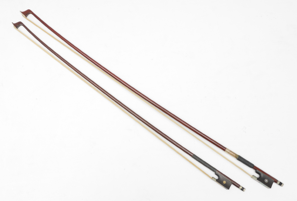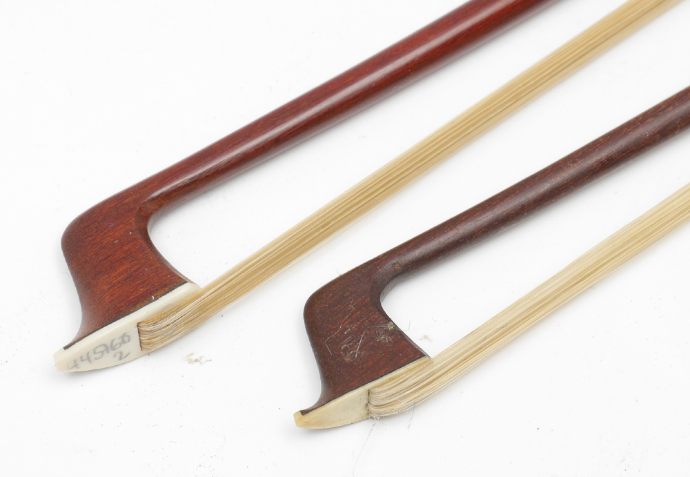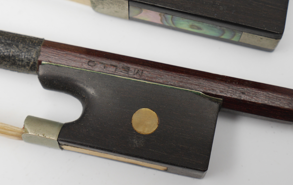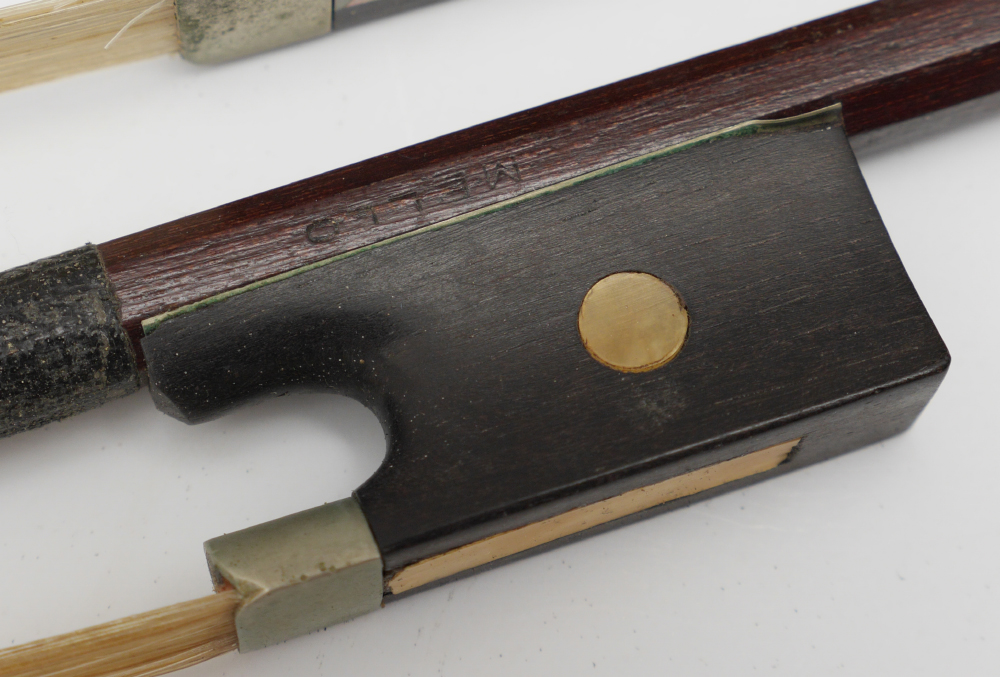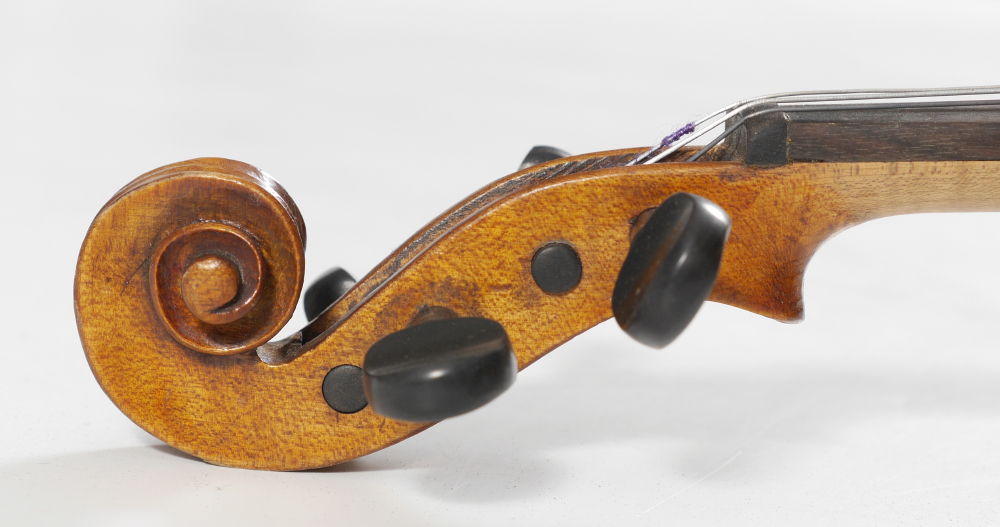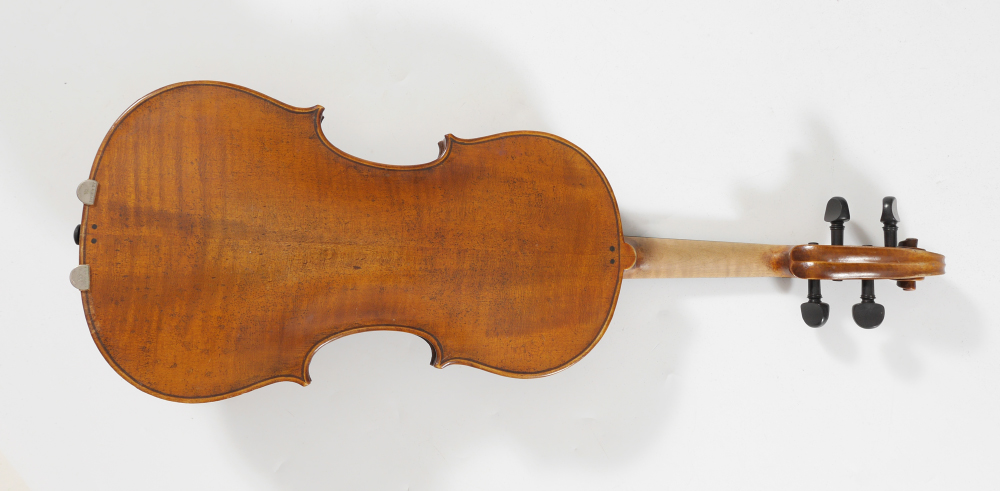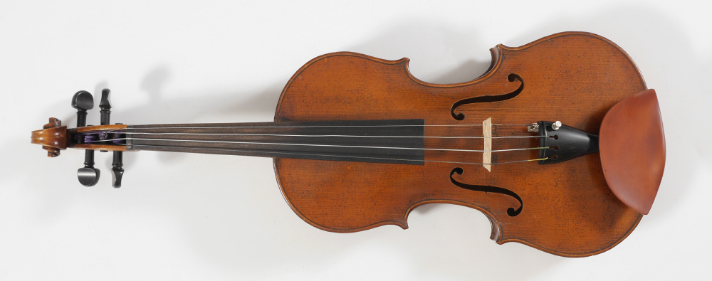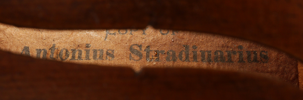 VINTAGE VIOLIN LABELED STRADIVARIUS: Late 19th / early 20th century, 2 piece 14'' back, labeled Copy of Stradivarius, overall 23 1/2''. Sold with 2 bows, one marked Mello, the other unmarked, and a hard case 31 1/2'' x 10'' x 5''.
