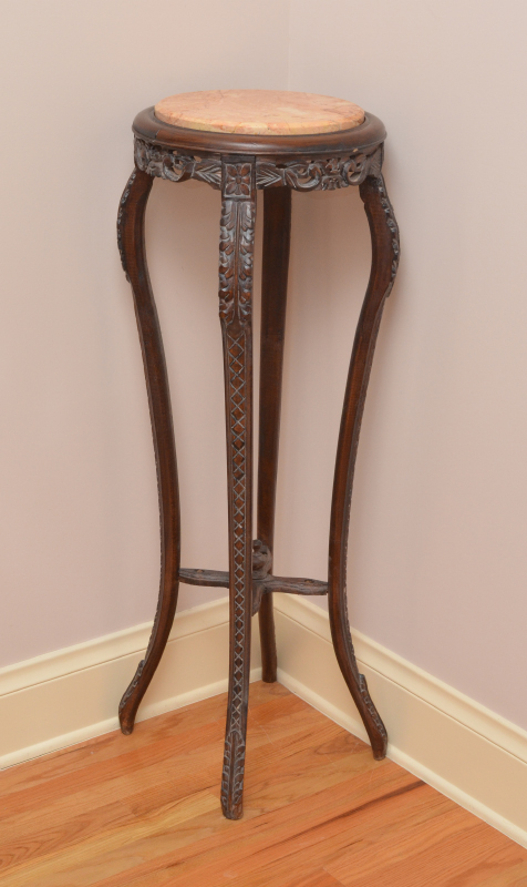 TALL MARBLE TOP PLANT STAND: Round inset marble top, pierced carved skirt, shaped legs, lower stretcher with finial, overall measures 45'' h. x 17 1/2'', marble 12 1/2'' dia.