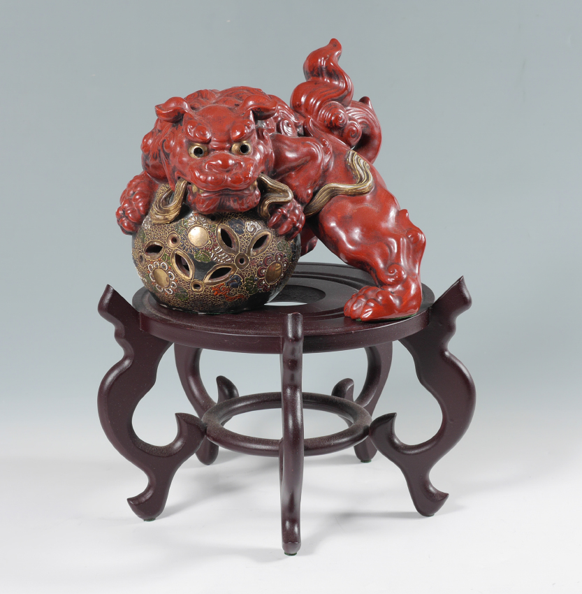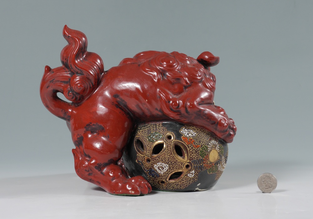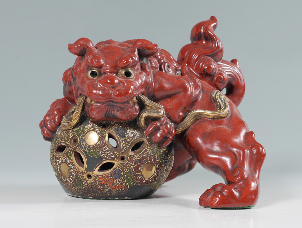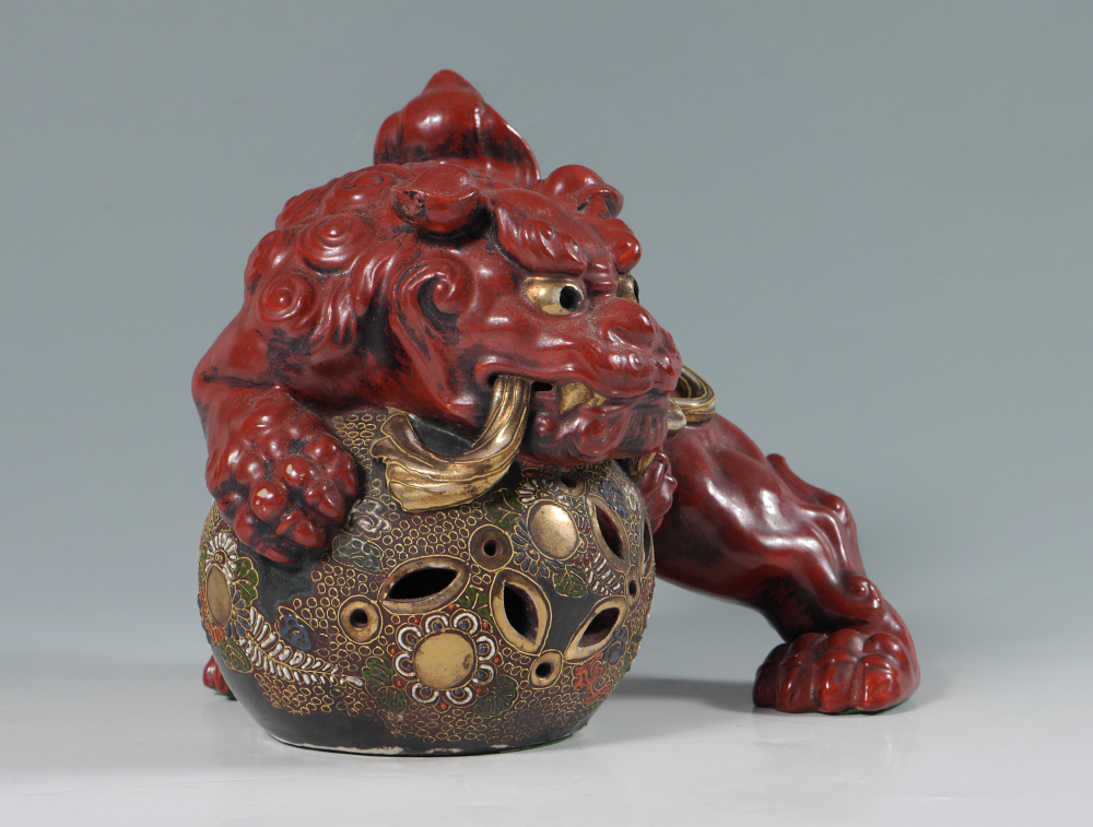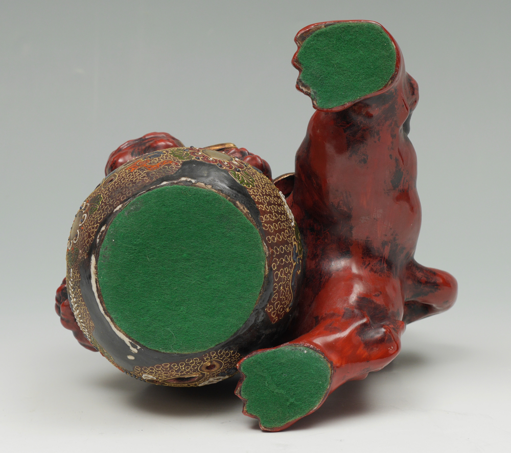 JAPANESE SATSUMA PORCELAIN FOO DOG: Red body foo dog with pierced satsuma decorated ball, gold ribbon in mouth, no visible markings, overall 8'' h. x 8'' x 9 1/2''.