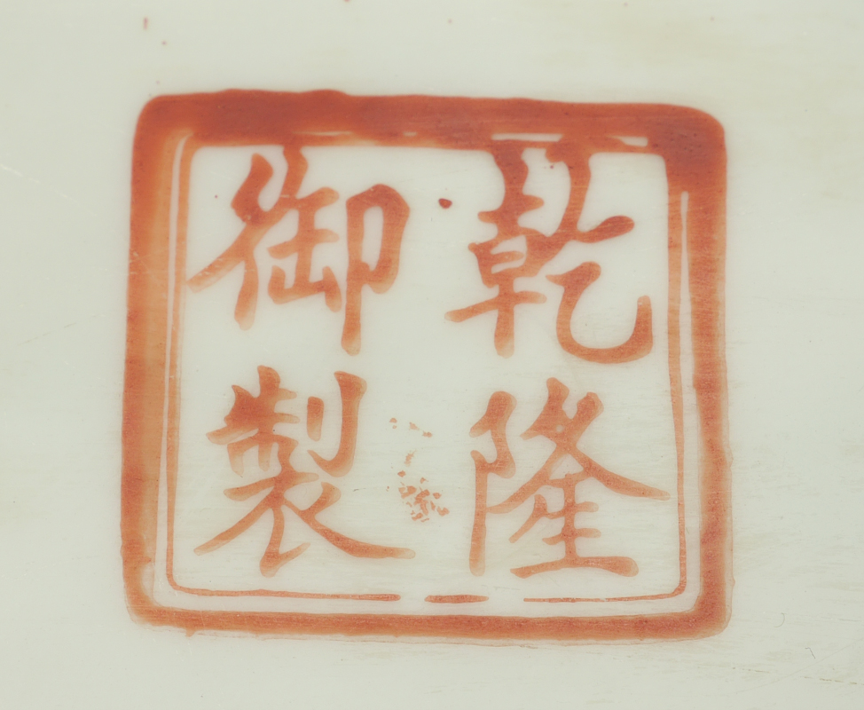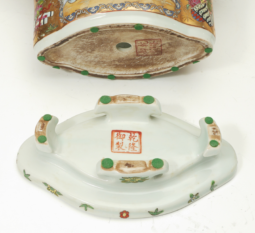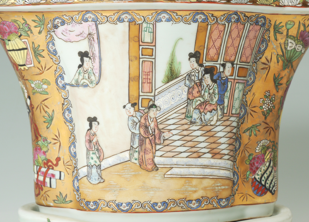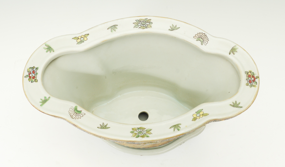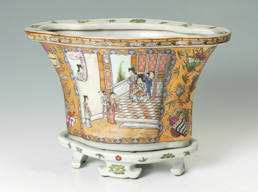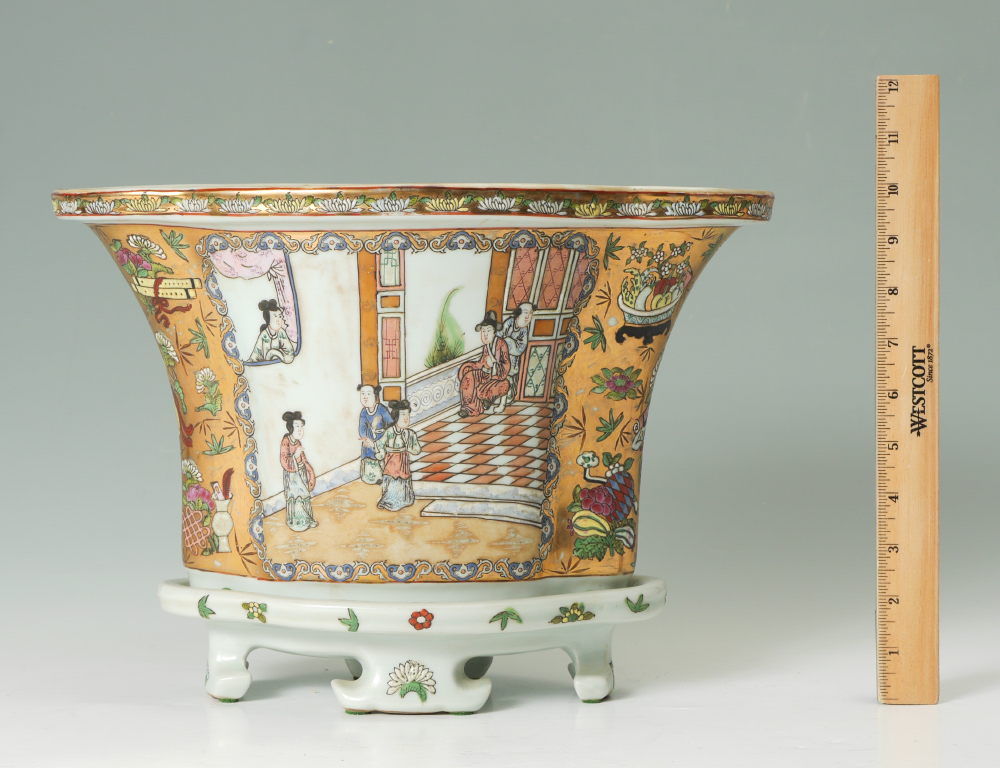 CHINESE ROSE MEDALLION JARDINIERE: Shaped rim and body, genre scenes either side, gilt and floral decorations on ends, red 4 character mark on base, 8'' h. x 14'' x 8 1/2'', separate footed base 2 1/4'' h. x 10'' x 6 1/2''.