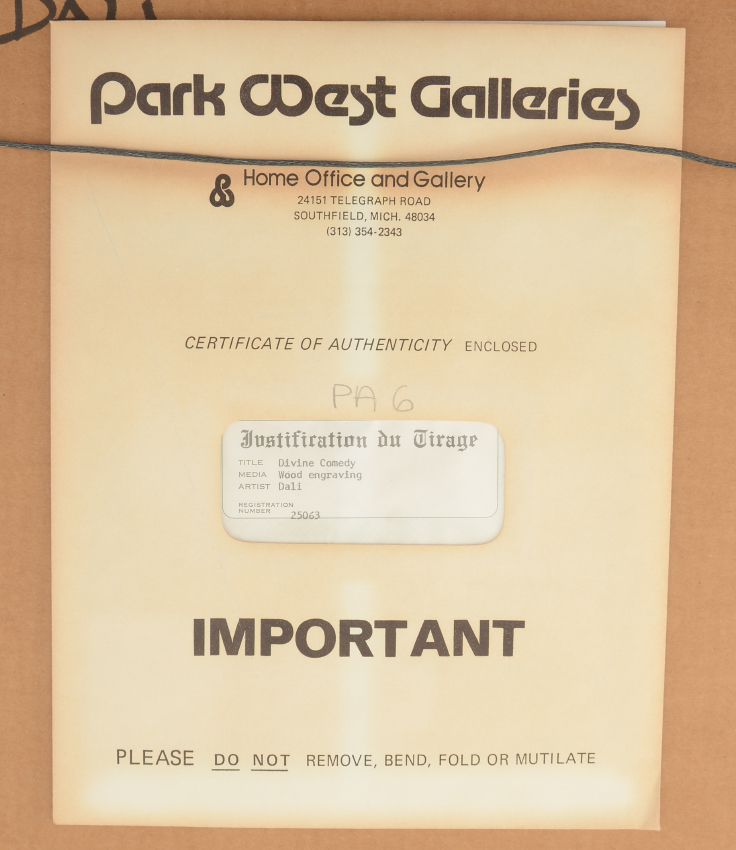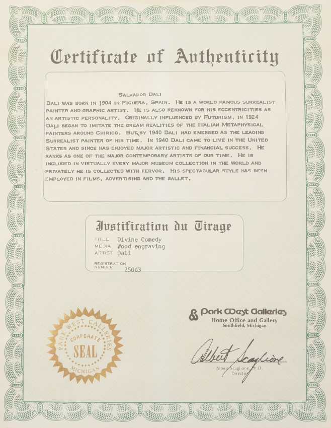 DALI, Salvador, (Spanish, 1904-1989): From the Divine Comedy Suite, Heaven Canto Six, Wood Engraving, sight size 11.75'' x 9.75'', signed in the plate, Park West label affixed verso, framed, 20'' x 18''.