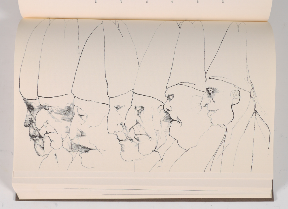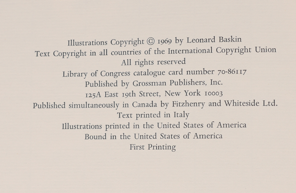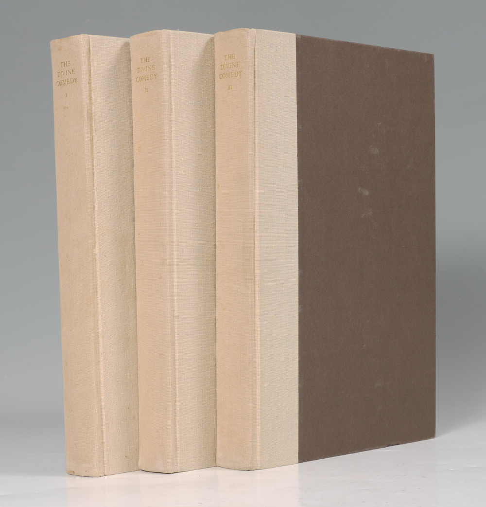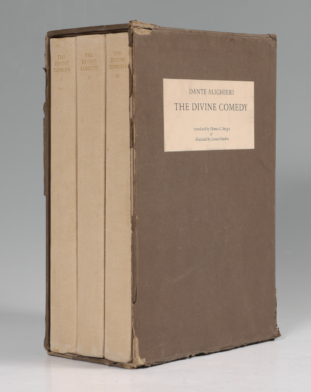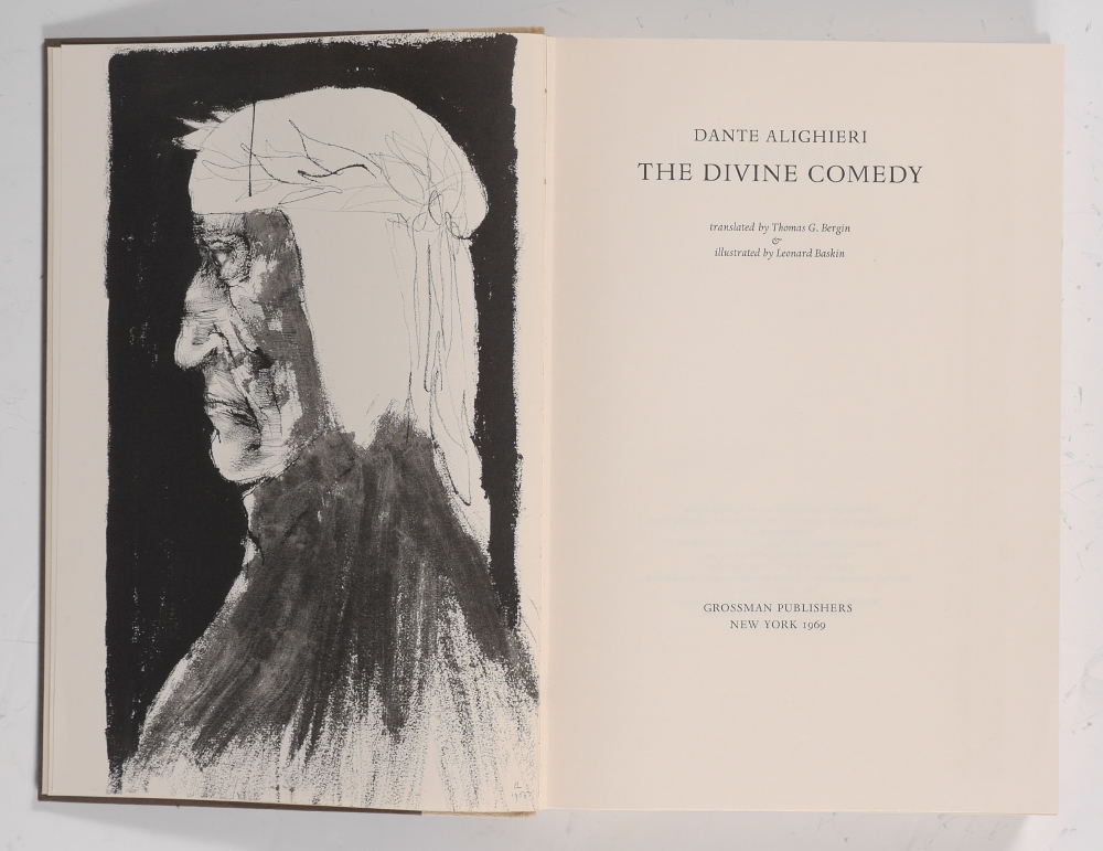 DIVINE COMEDY ILLUSTRATED BY LEONARD BASKIN: 3 volumes ''The Divine Comedy'', Dante Alighieri, translated by Thomas G. Bergin and illustrated by Leonard Baskin. Published by Grossman Publishers, New York, 1969. Cloth covers with embossed spines, each volume 13 1/4'' x 9 1/4'' x 1 1/2''. Original slipcase 14'' x 9 1/2'' x 5 1/2''.