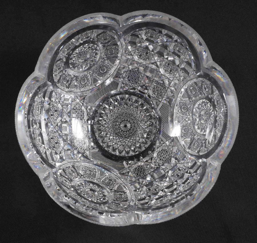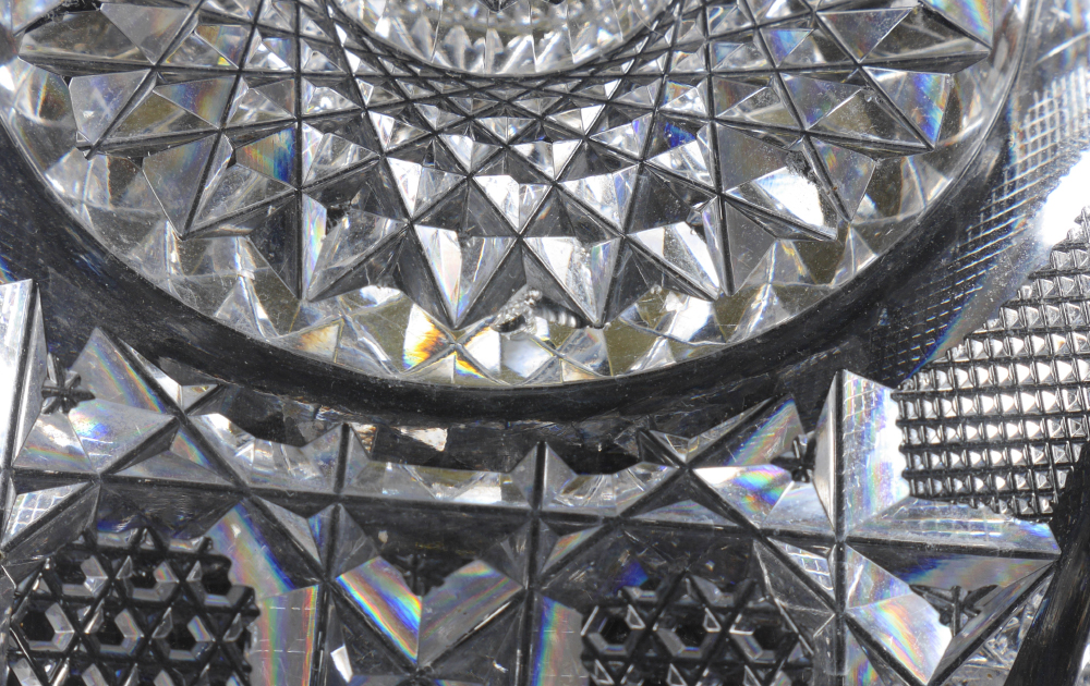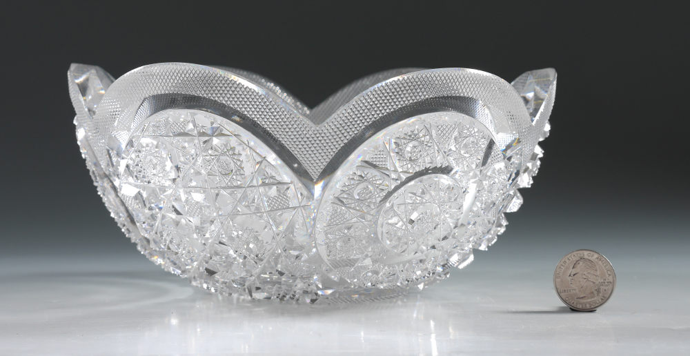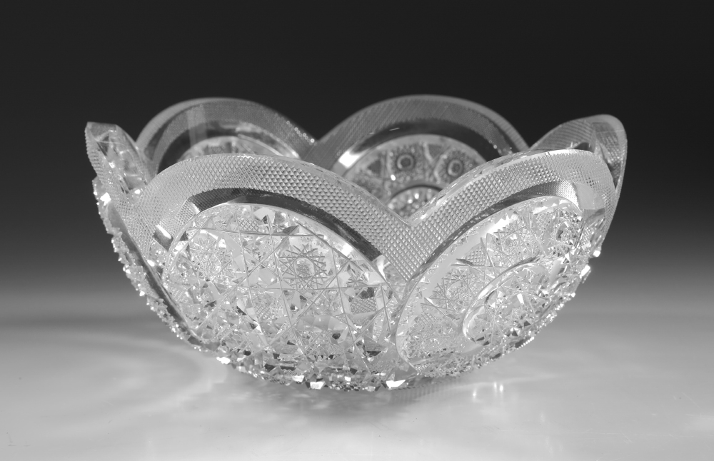 FINE AMERICAN BRILLIANT PERIOD CUT GLASS BOWL: Finely detailed cuts, smooth rim with delicate small diamond border, no visible marks but of J. Hoare quality. Overall measures 4'' h. x 8'' dia.