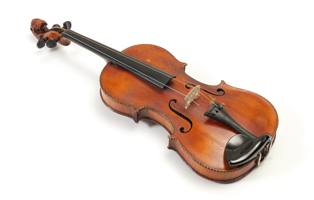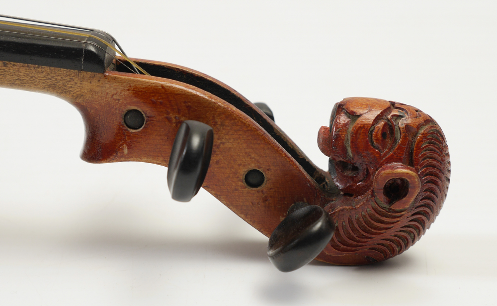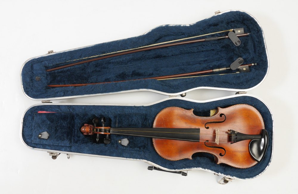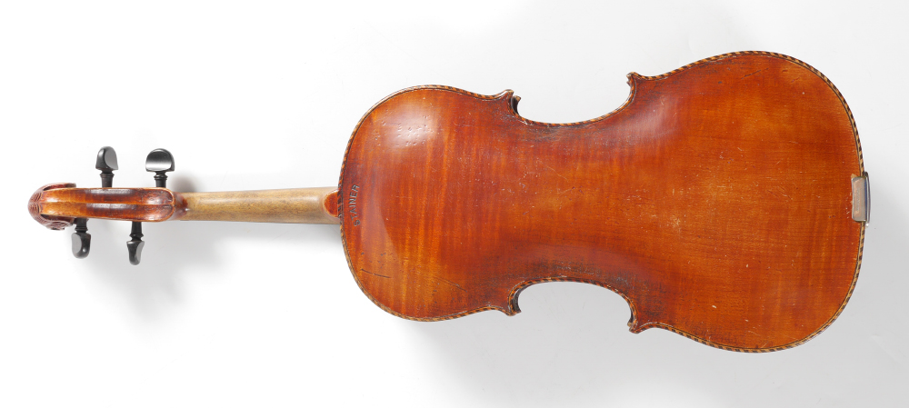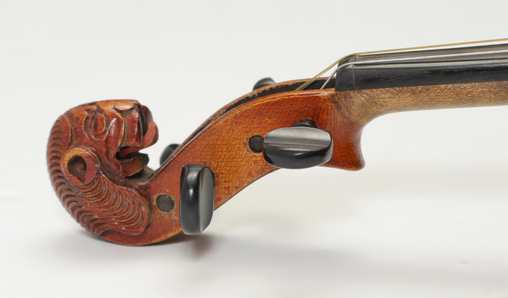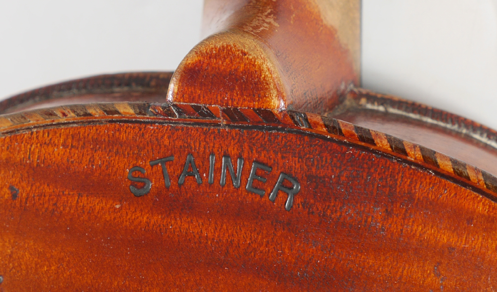 VINTAGE CARVED VIOLIN STAMPED STAINER: Single piece 14'' back stamped Stainer, rope twist inlay along top and bottom lining of rib, figural creature bust carved scroll. Overall 24'' long. Sold with 2 bows, one marked Slassaro (57.2 grams), the other unmarked (62.6 grams), and a hard case, 32'' x 11'' x 6''.