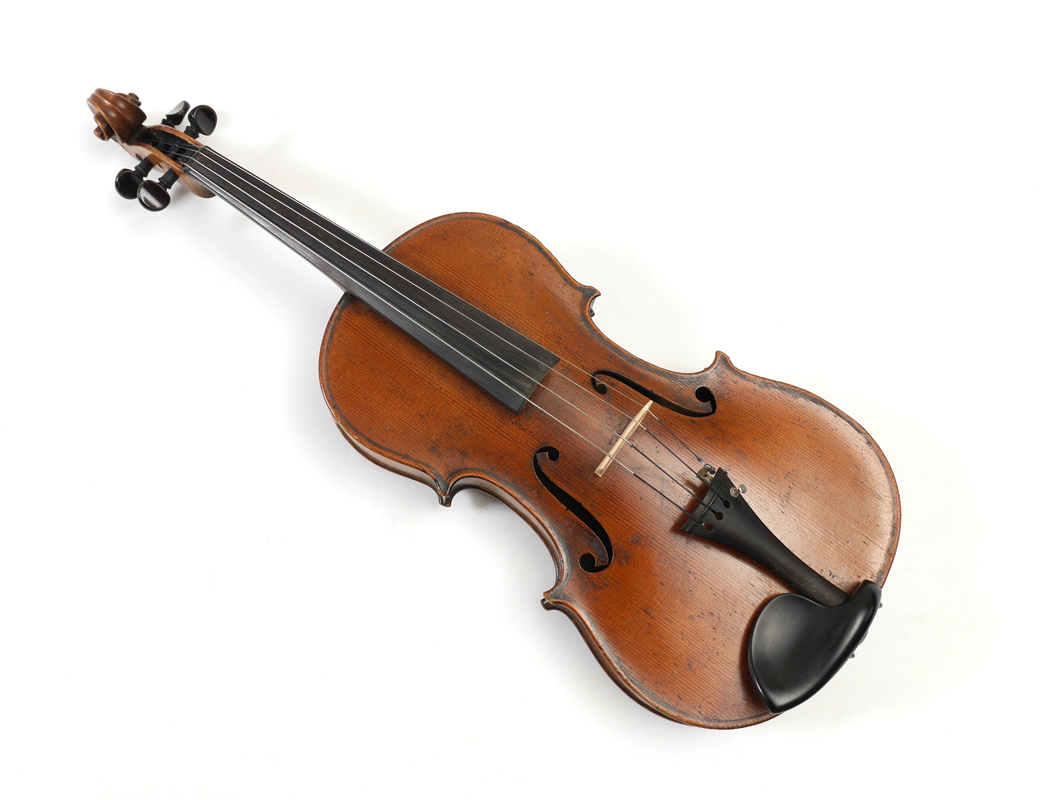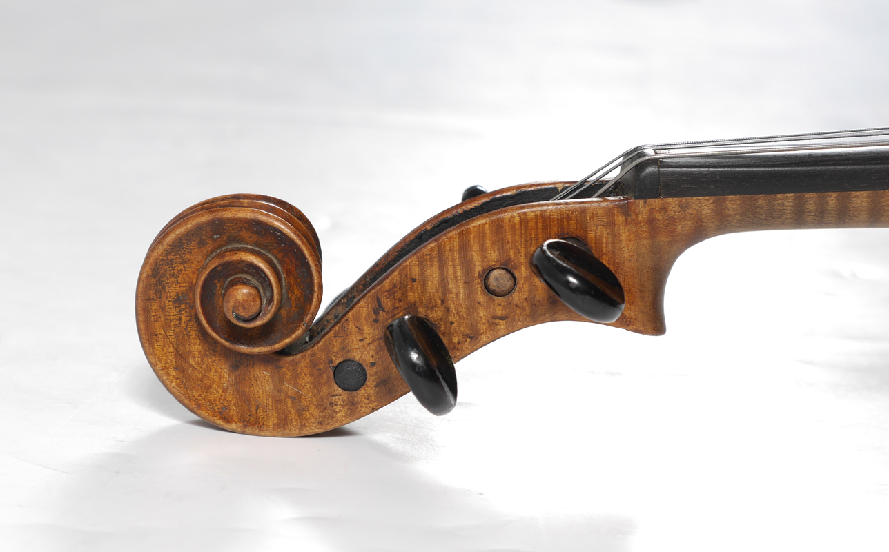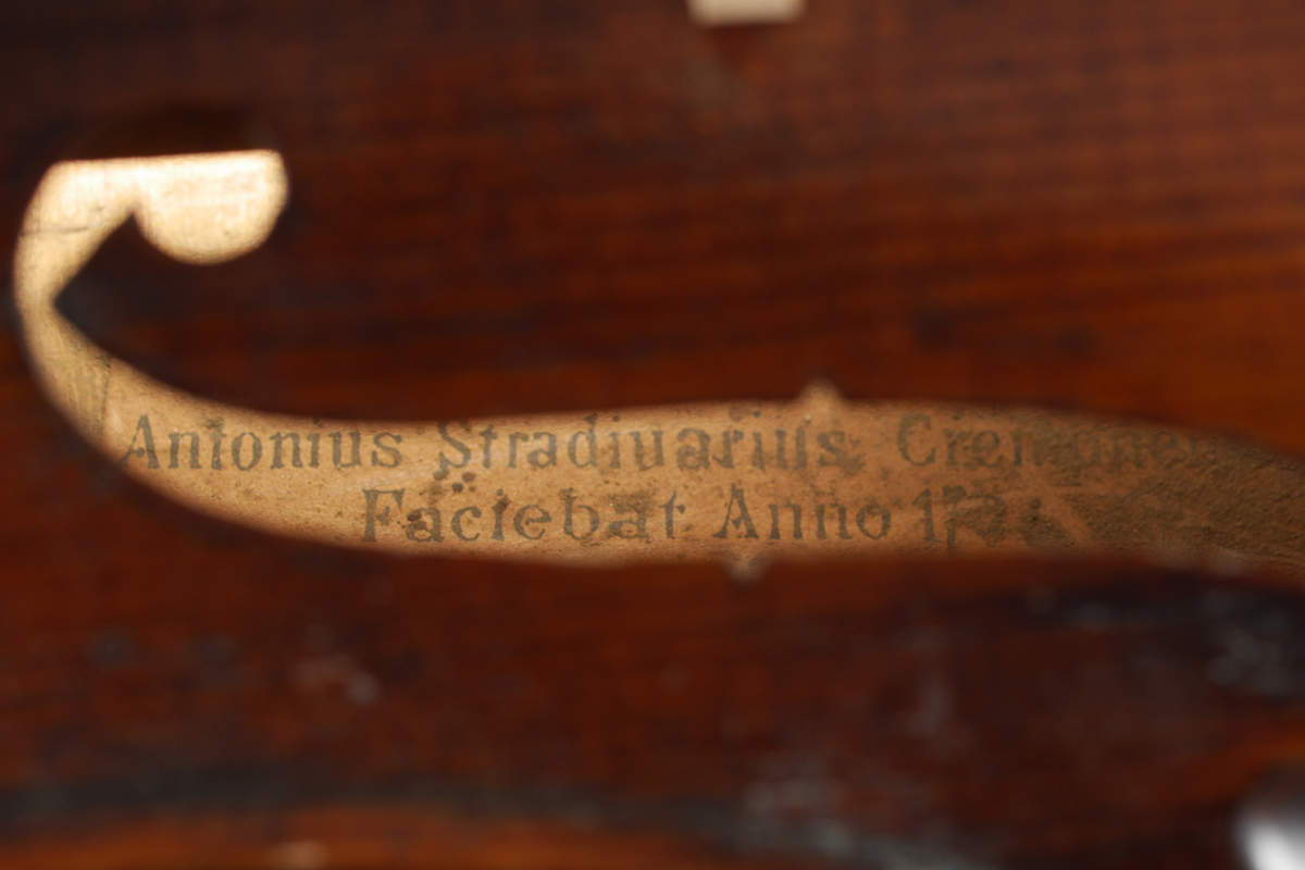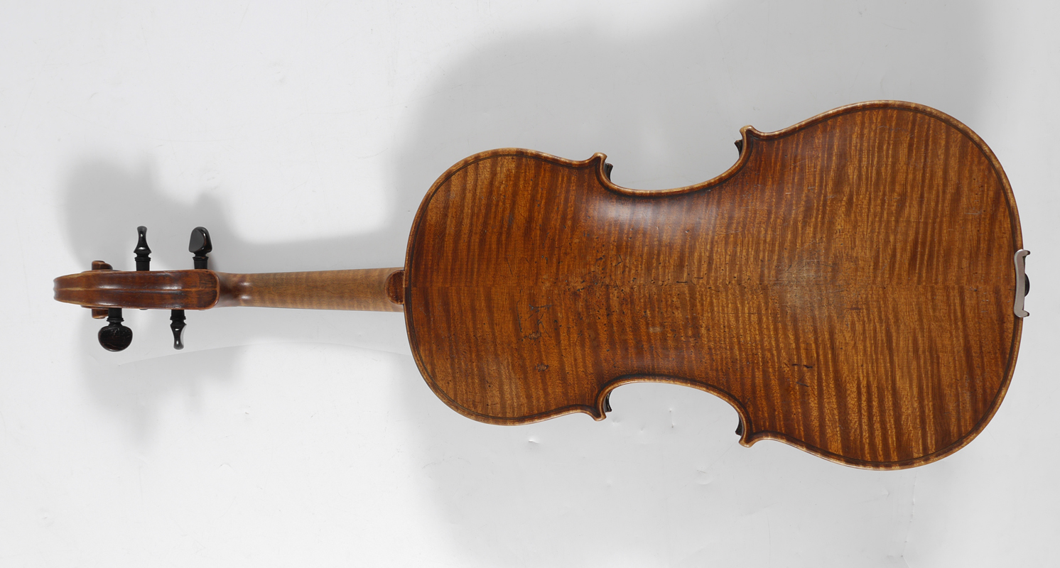VINTAGE SMALL VIOLA LABELED STRADIVARIUS: Continental, most likely German early 20th century, 2 piece 15 1/2'' back, string inlay border, Stradivarius label, overall 26 1/2''. Sold with unmarked bow (59.2 grams), and a hard case 32 1/2'' x 10 1/2'' x 5''.