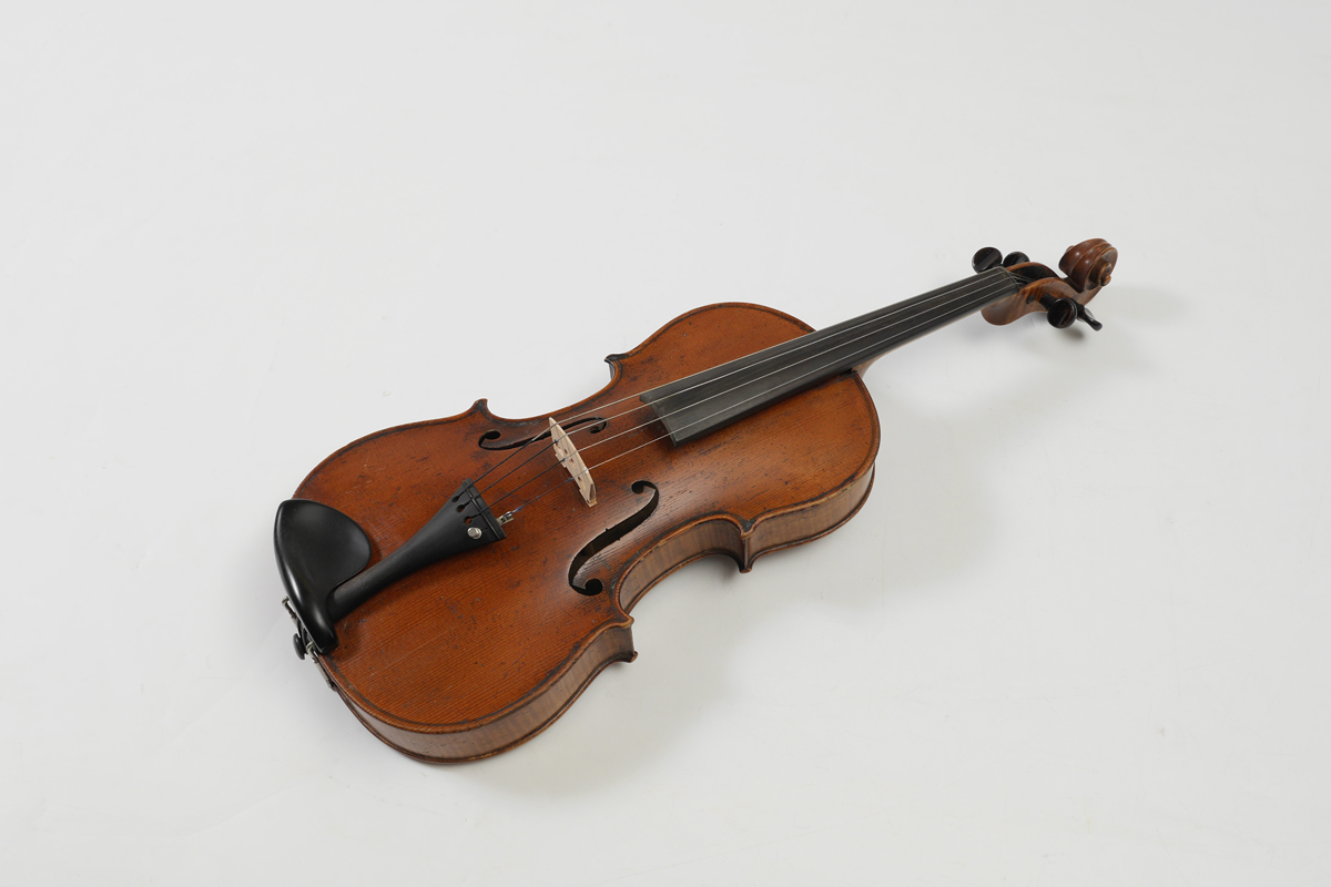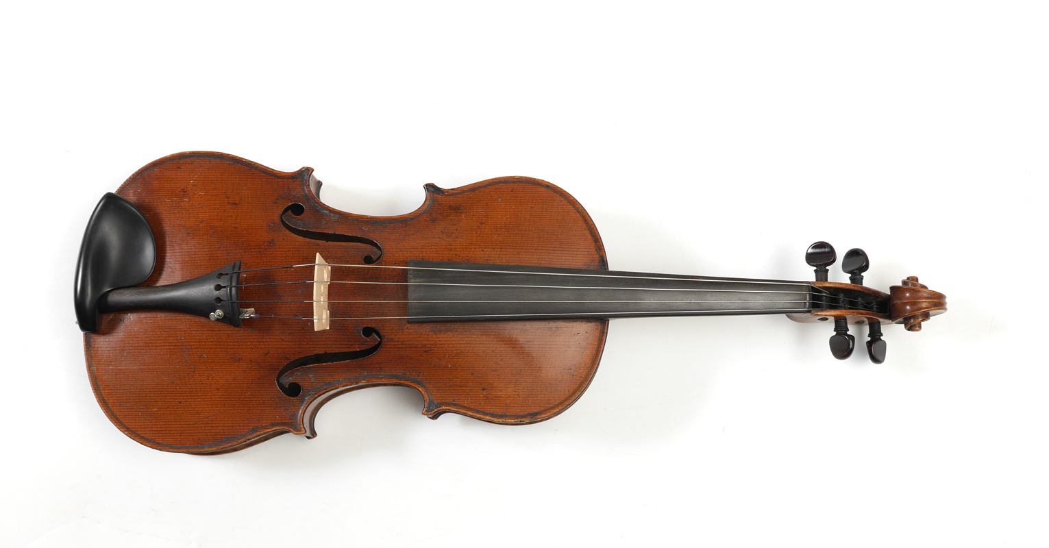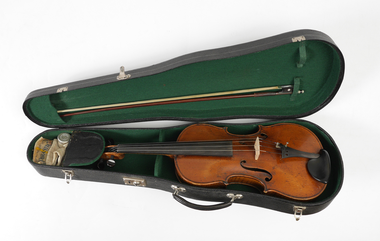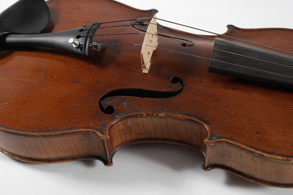 VINTAGE SMALL VIOLA LABELED STRADIVARIUS: Continental, most likely German early 20th century, 2 piece 15 1/2'' back, string inlay border, Stradivarius label, overall 26 1/2''. Sold with unmarked bow (59.2 grams), and a hard case 32 1/2'' x 10 1/2'' x 5''.