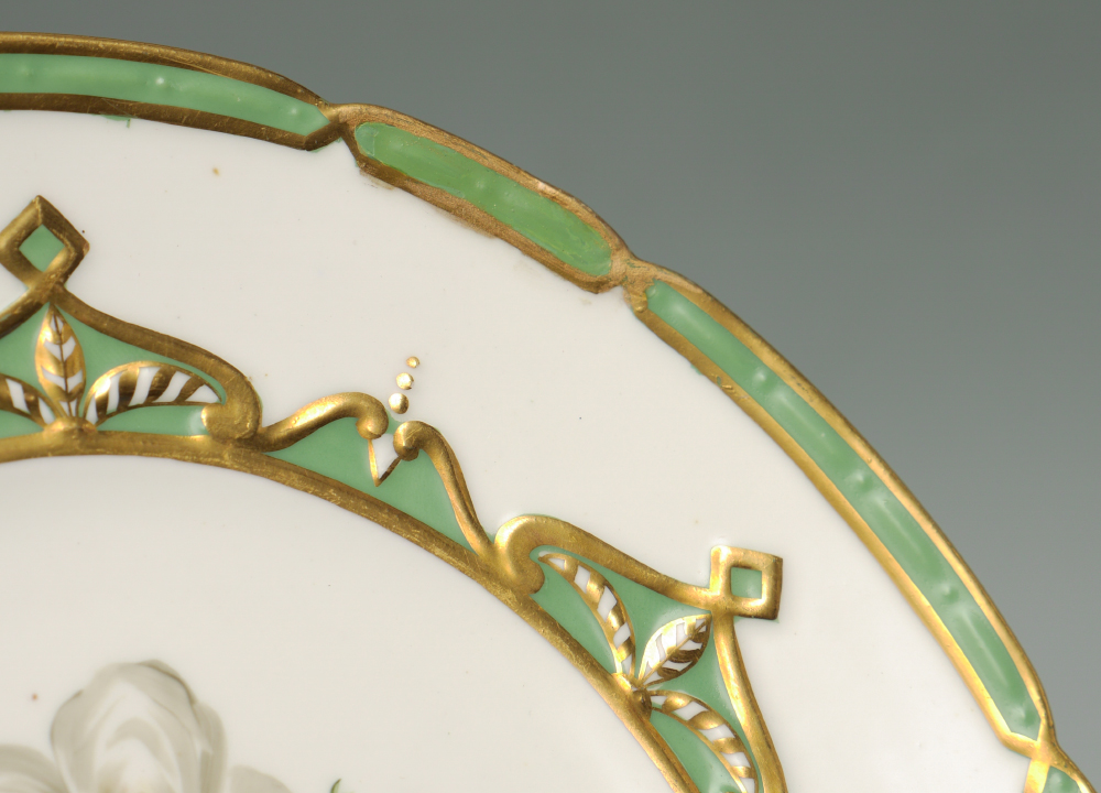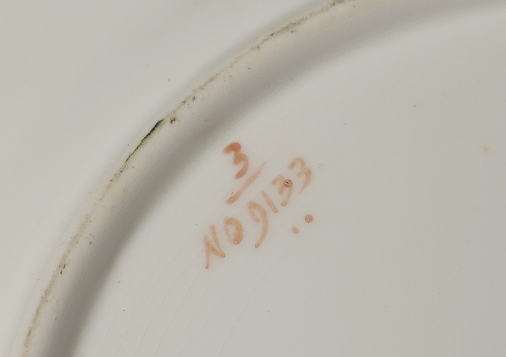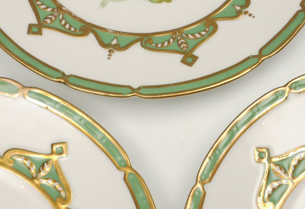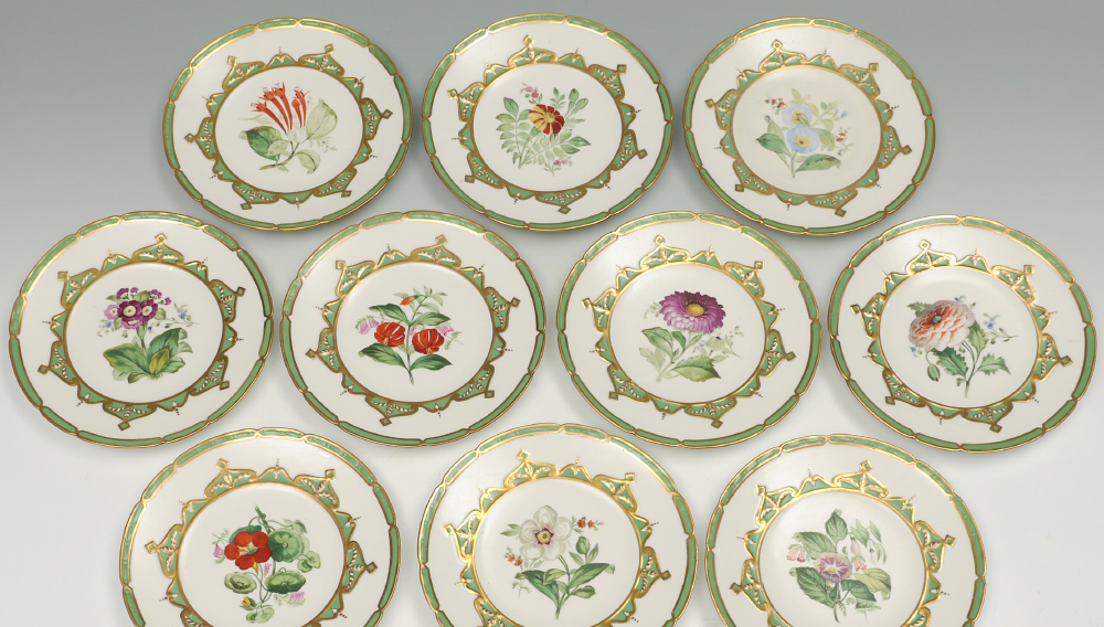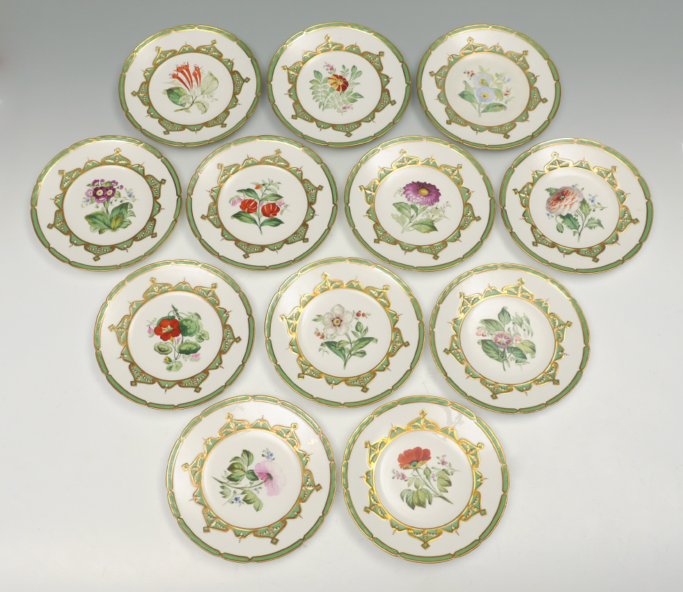 SET OF 12 FRENCH HAND PAINTED BOTANICAL PLATES: 19th century, each plate hand painted with a different flower, green and gilt borders, simply marked 3/No 9133, 9'' dia.