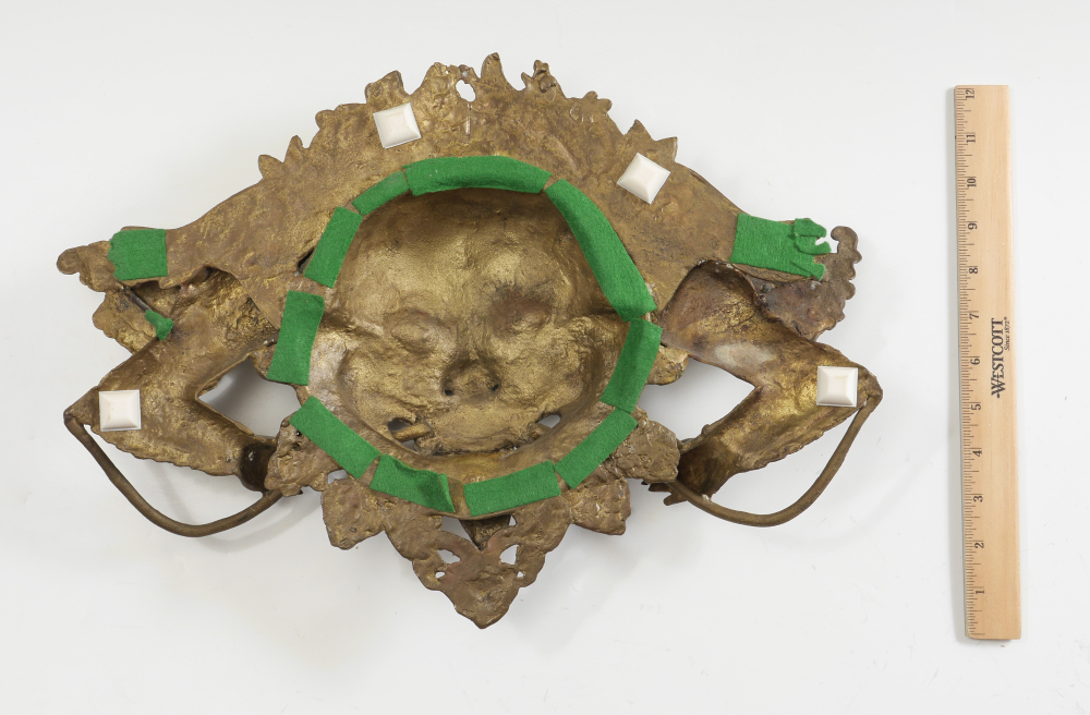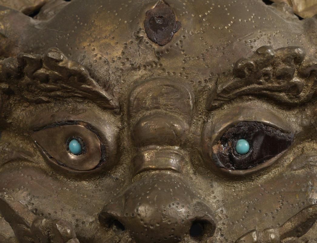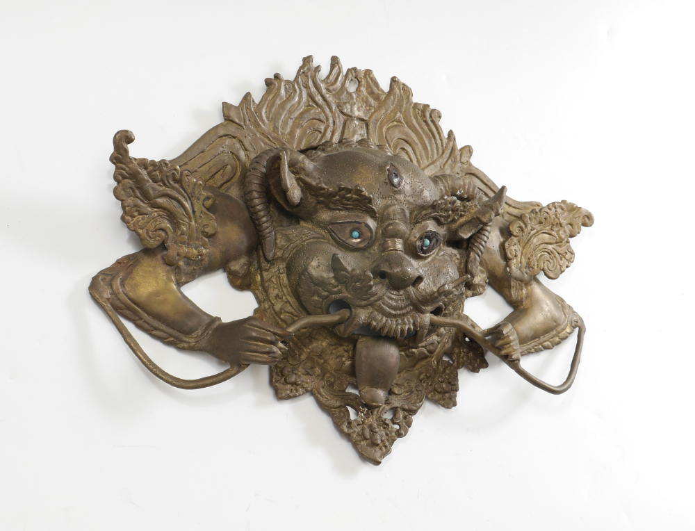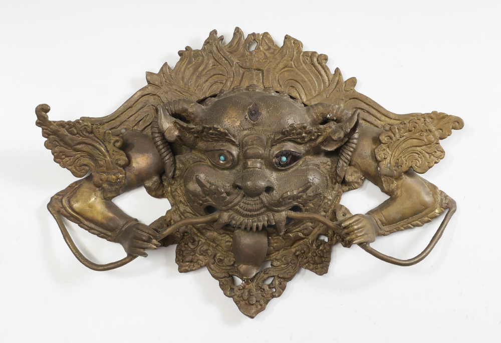 SINO-TIBETAN BRONZE MASK: Heavy cast bronze horned deity with blue stone eyes, mouth open baring teeth and tongue, arms holding bar in mouth. Overall measures 11 3/4'' h. x 17 1/2'' x 2 1/2''.