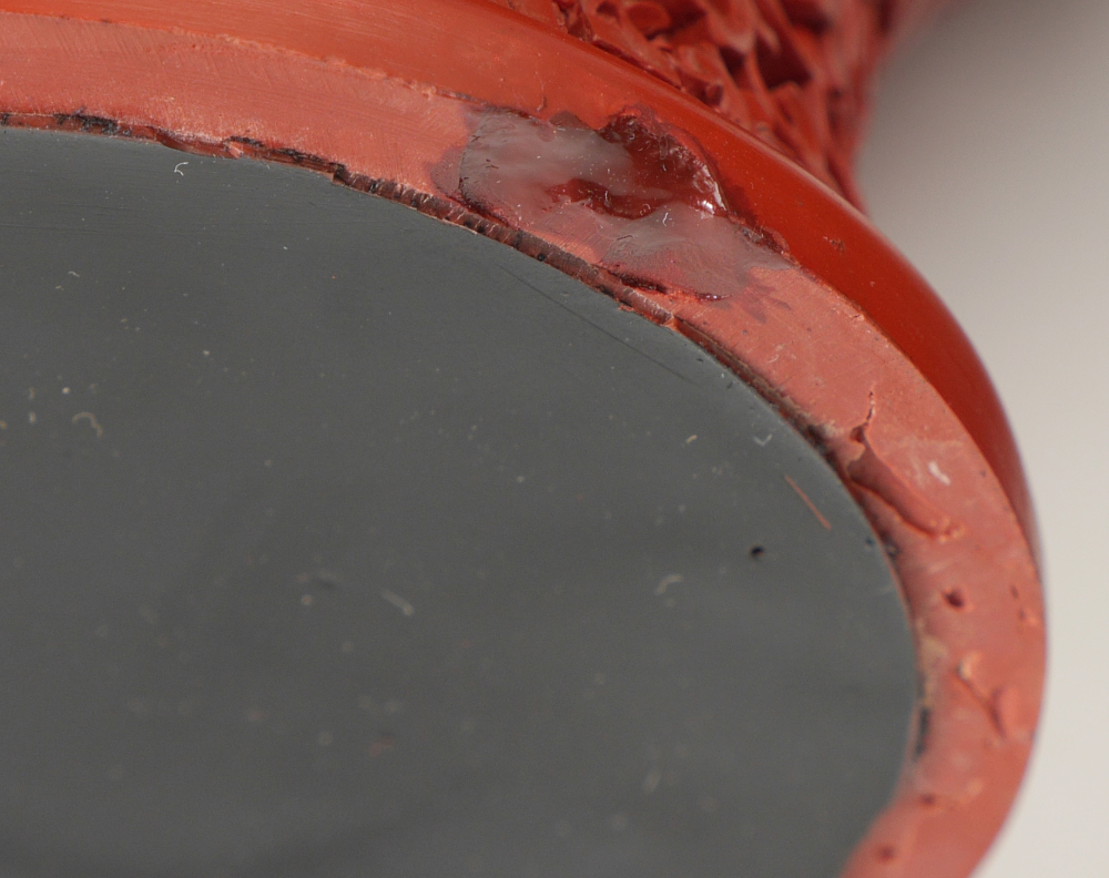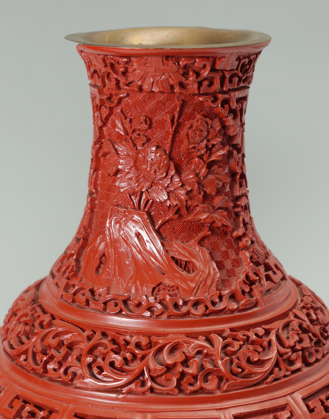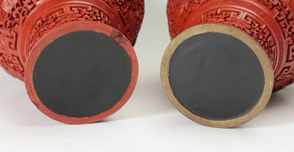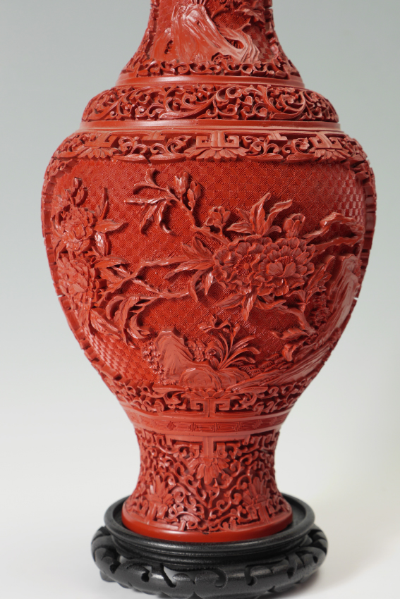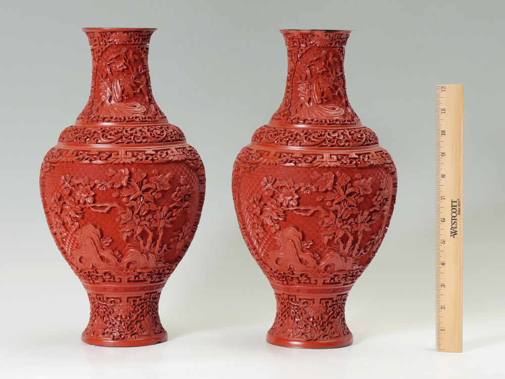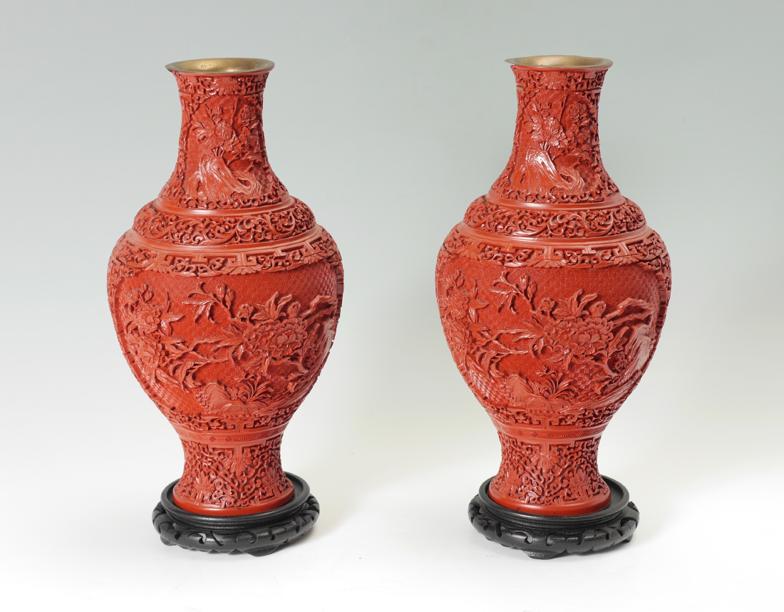PAIR CHINESE CINNABAR LACQUER VASES: Matched pair with flared neck and foot, ovoid body, carved floral decoration all over, no visible markings, each 14 1/2'' h. x 7 1/2''. Sold with wood bases 1 1/2'' h. x 5 3/4''.