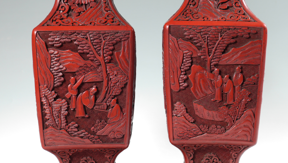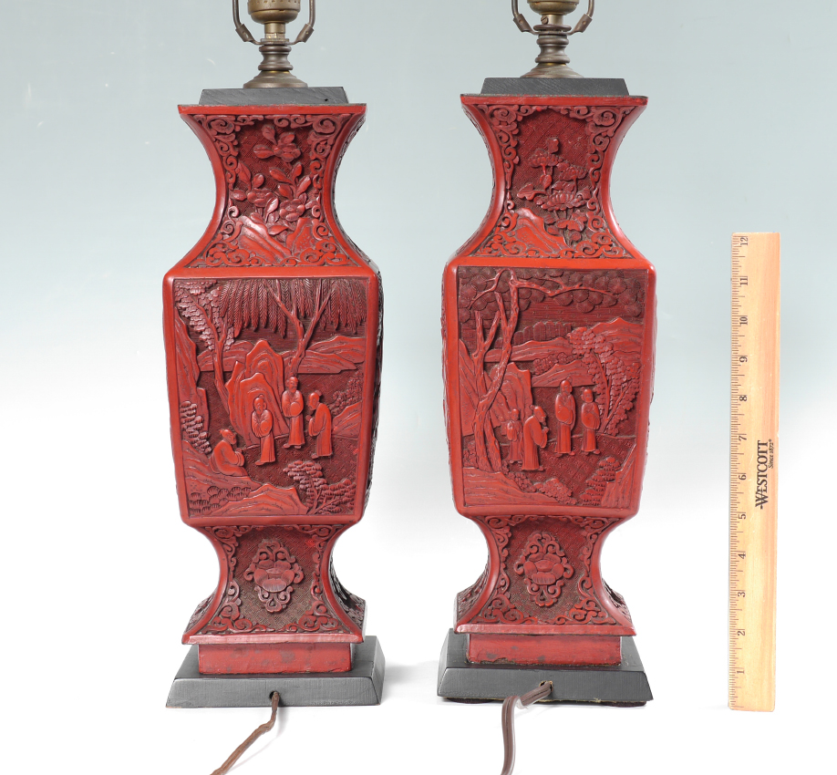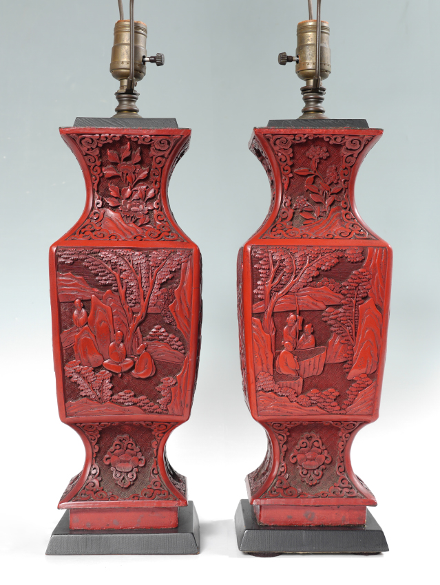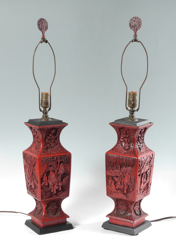 PAIR OF CHINESE CINNABAR TABLE LAMPS: Carved red cinnabar with outdoor genre scenes and floral motifs in panels. Black wood base, single socket fixture, metal finial, no shade. Overall 30'' h. x 5 1/2'' x 5 1/2''.