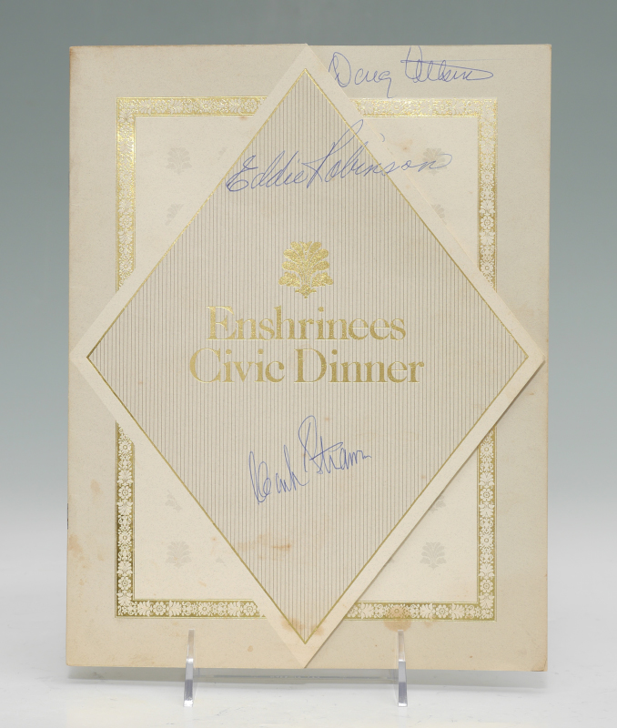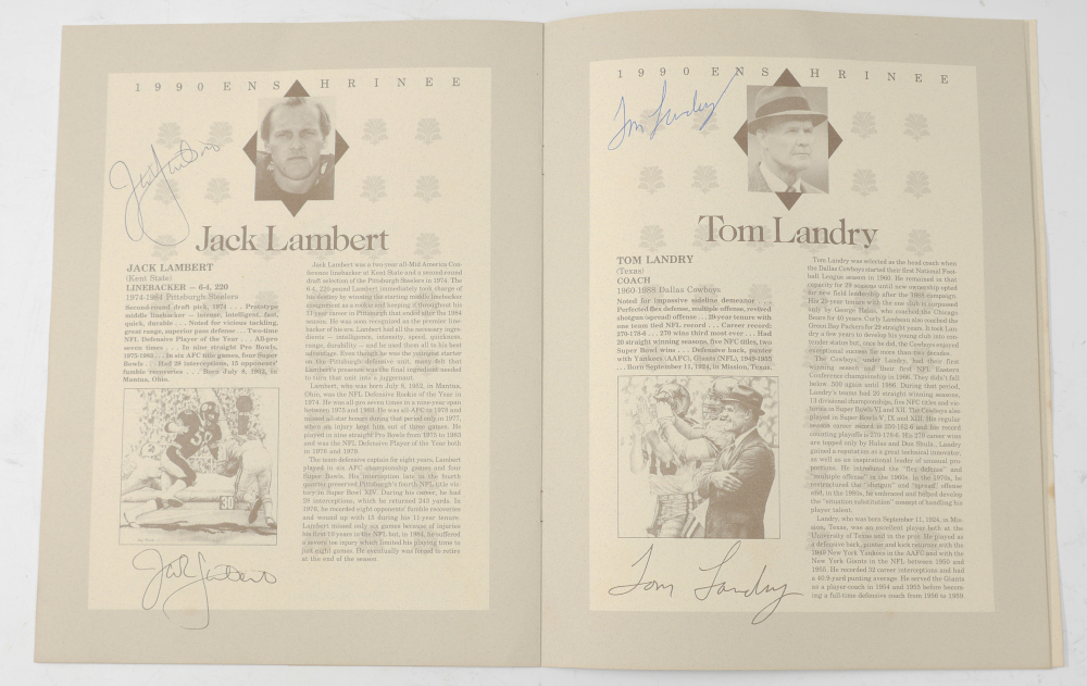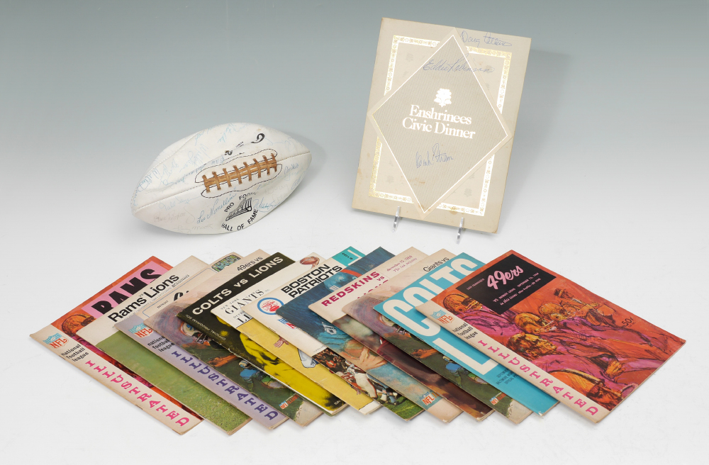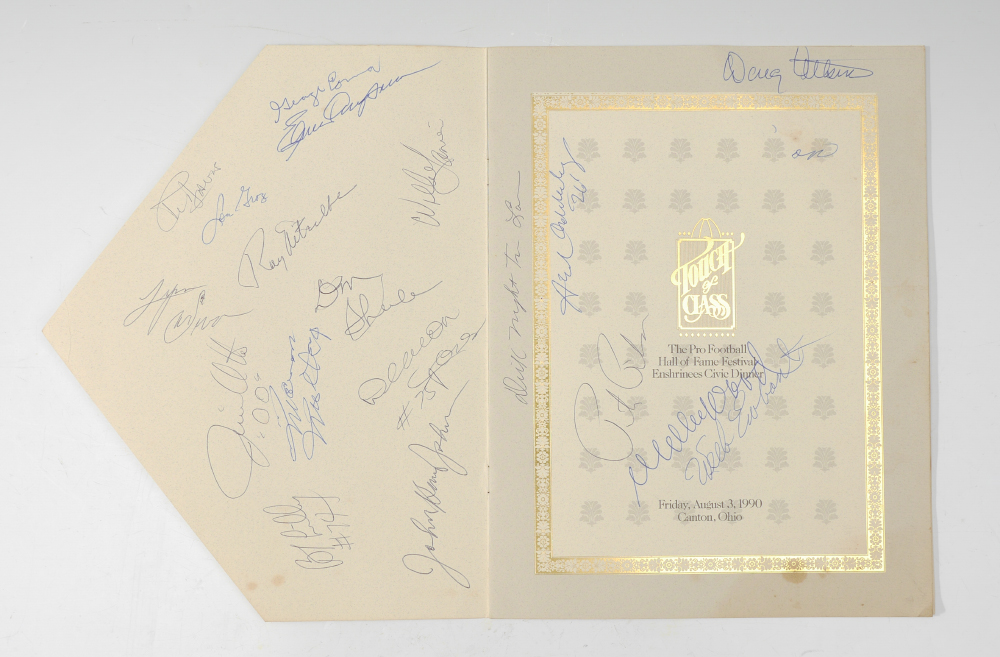 HALL OF FAME SIGNED FOOTBALL, PROGRAMS, & DINNER PROGRAM: A nice collection of NFL football players photographs to include 1) Pro Football Hall of Fame, signed by approx. 62 players, highlights to include Joe Namath, Otto Graham, Art Shell, Bart Starr, Lew Dawson, too many to list completely. 2) 1990 Enshrinees Civic Dinner program, again filled with approx. 26 autographs including Tom Landry. 3-15) 12 assorted Detroit Lions programs from various years.