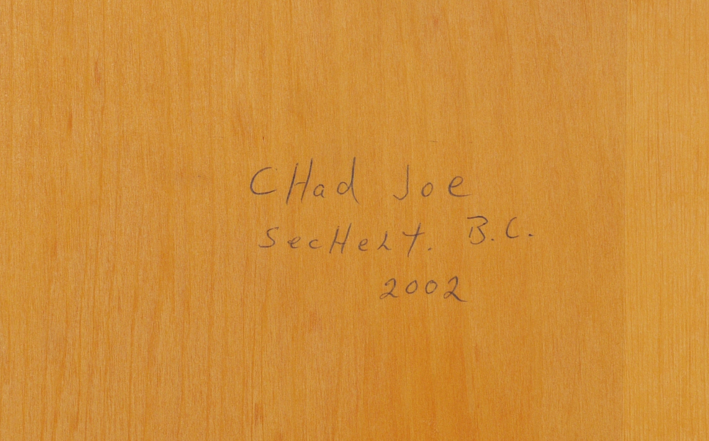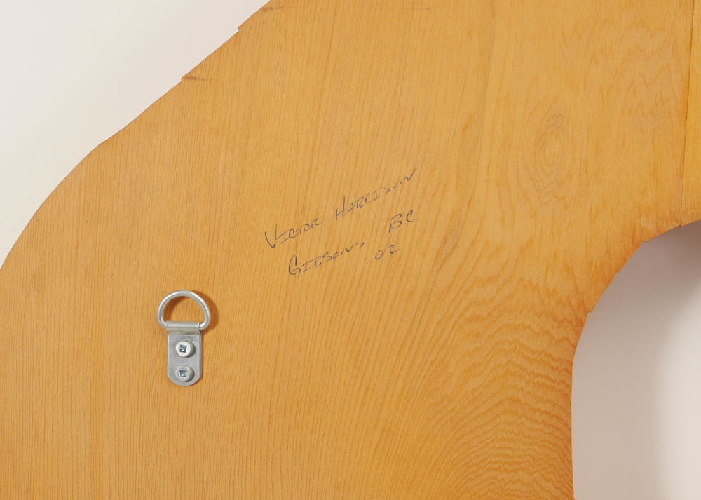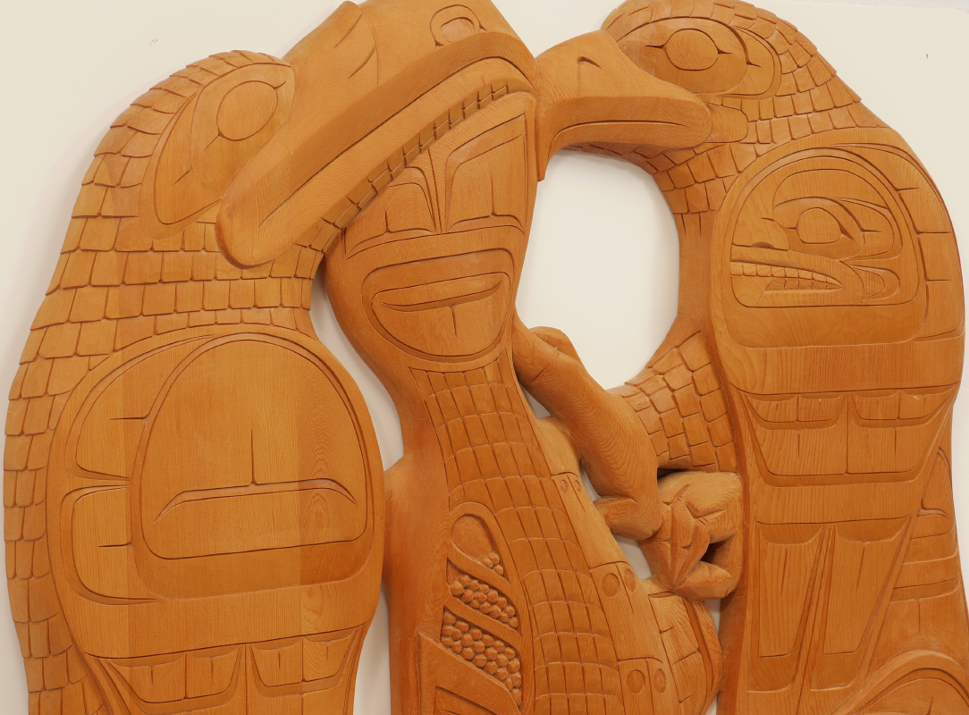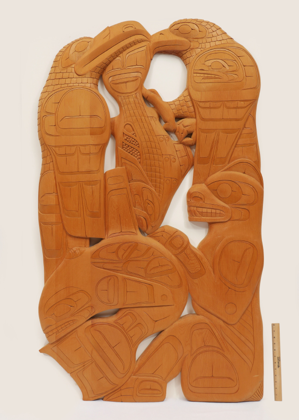 HARRISON, Victor, (Canadian, 1951-): Northwest British Columbia Metis culture figural wood carving featuring birds, fish and bear. Unpainted, signed on back with Victor Harrison and Chad Joe, dated 2002. Overall measures 60'' h. x 36'' x 2''.